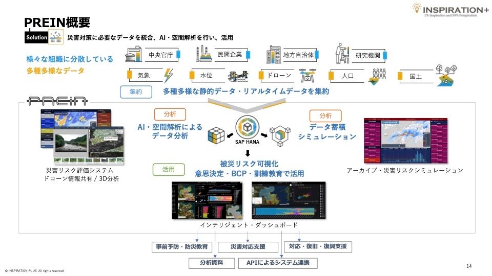 この度のシリーズAラウンドでの資金をもって、株式会社INSPIRATION PLUSは、防災・減災のための情報活用プラットフォーム『PREIN』のさらなる機能強化と開発体制強化に取り組んでまいります。