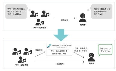 フリーBGM利用の増加に伴い、フリーBGMを利用する法人、団体を中心に適切な権利処理がされ、安心して利用できる楽曲であるかの確認を求める要望が上がる一方、フリーBGM作曲家は法人や団体が求めるような細やかな情報提供やサポートをすることが難しいという課題を抱えております。