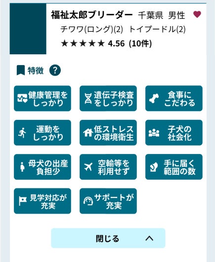 当サイトでは、審査の結果、ブリーディングの中で素晴らしいと判断した部分(上記の総合基準に関して)についてタグを付与し、ブリーダー一覧画面で可視化しております。更に、ブリーダー詳細画面で、付与したタグに関する具体的な内容も掲載しております。結果として、ブリーダーさんのこだわりや価値をユーザーにしっかり伝えることができ、ユーザーも安心してブリーダーさんを選ぶことができます。