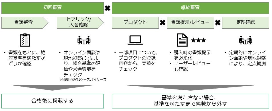 当サイトは、初回審査と継続審査を厳格に行います。初回審査では、書面審査のみならずヒアリングや犬舎確認まで行い、上記選定基準をどこまで満たしているか、正確な情報を提供しているかしっかりチェックします。継続審査では、プロダクトを使ったチェックやユーザーへの書類提出の義務づけ、定期的なヒアリング等により、掲載継続可否を判断していきます。