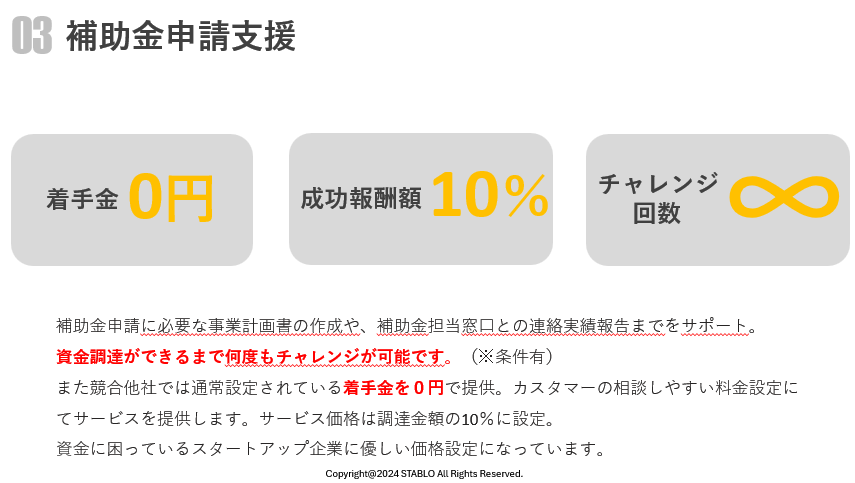 スタブロでは補助事業経験豊富なプロフェッショナルが、事業計画書の作成から補助金申請、実績報告までをサポートします。