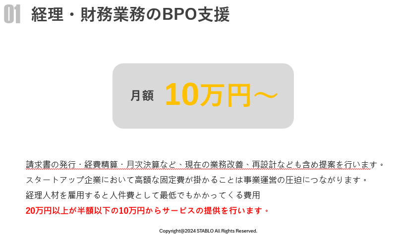 スタートアップ企業にとって雇用など高額な固定費を抱えることは事業運営の圧迫につながるため、事務ポストの半分の経費である月額10万円~の料金設定をしています。