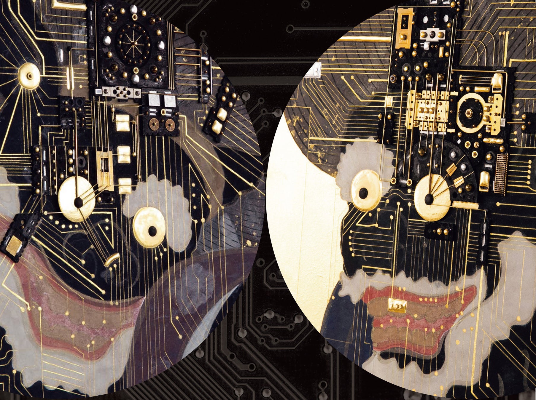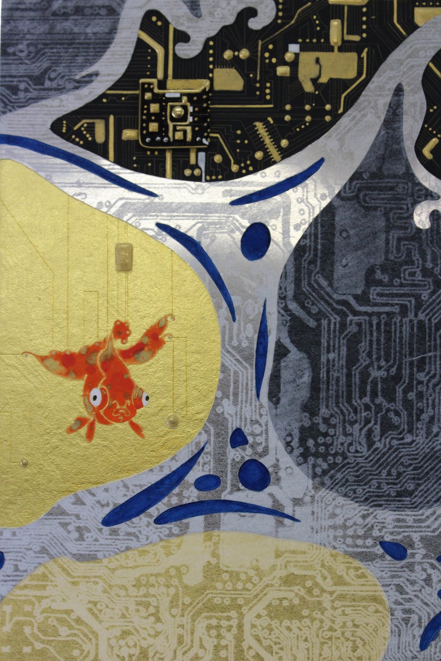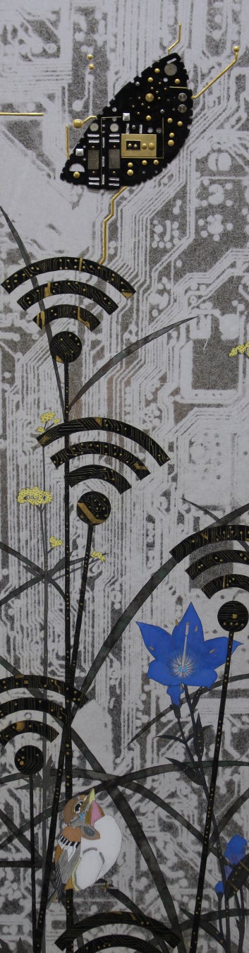 現代社会の「つながり」を担う半導体のシステマチックな点や線の集積に、その機能に比類する美を見出す西嶋は、2016年ごろから、花の‘しべ’を貪欲に電波を絡め取ろうと伸ばす‘触手’に見立て、半導体を金線で描いた「Electric Flower」シリーズなど、「未来」を描く独自の日本画に挑んできました。