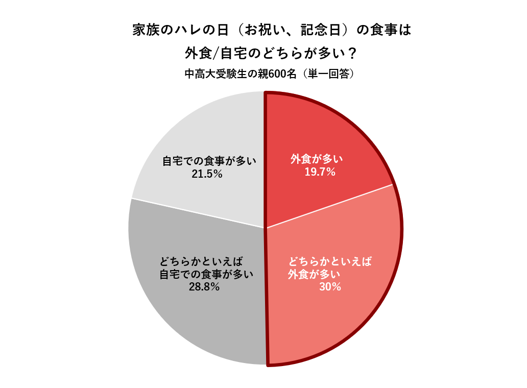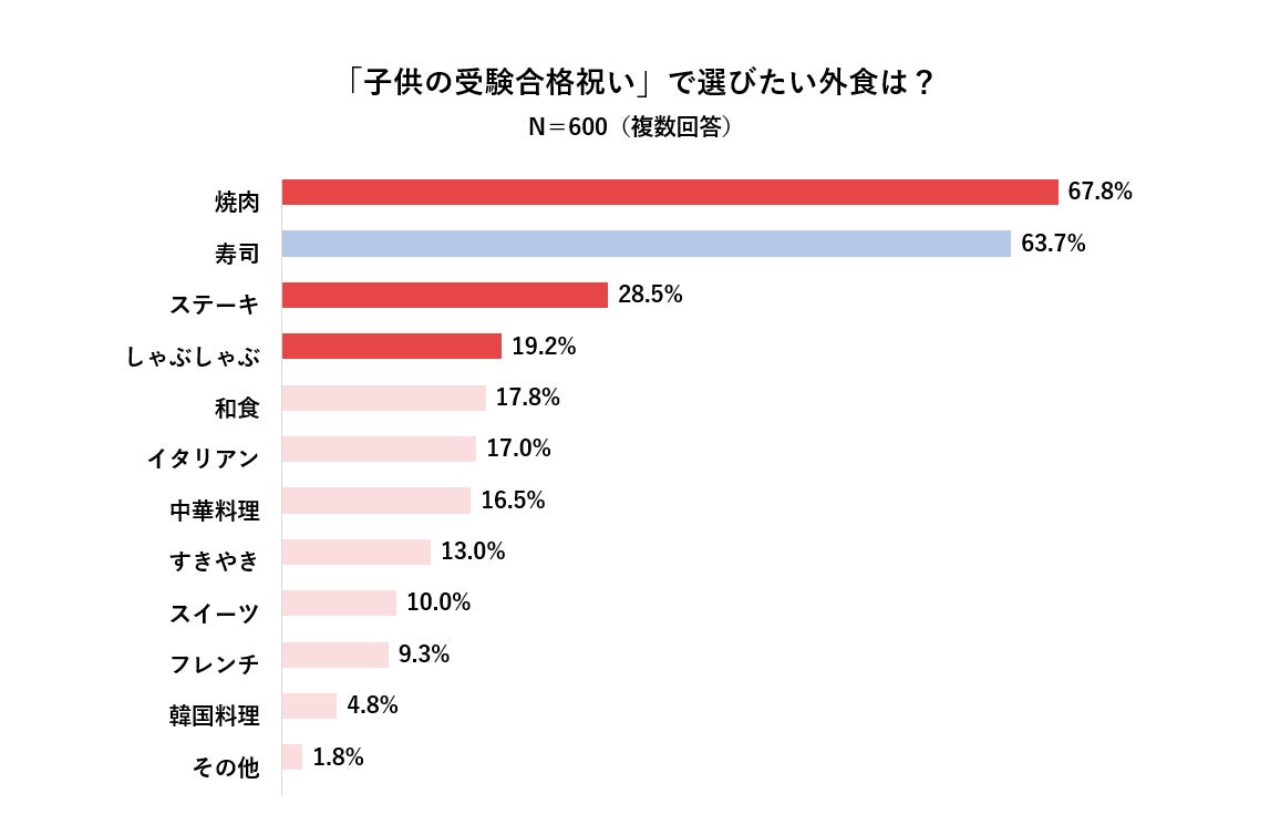 中高大受験生の親を対象に「ハレの日の食事に関する意識調査」を実施した結果、家族で外食をしたくなるハレの日として、「子どもの受験合格祝い」が2位にランクインしました。また、子どもの受験合格祝いで選びたい外食として、「寿司」を抑えて「焼肉」が1位に。3位「ステーキ」4位「しゃぶしゃぶ」が続くなど、肉料理が人気であることが分かりました。