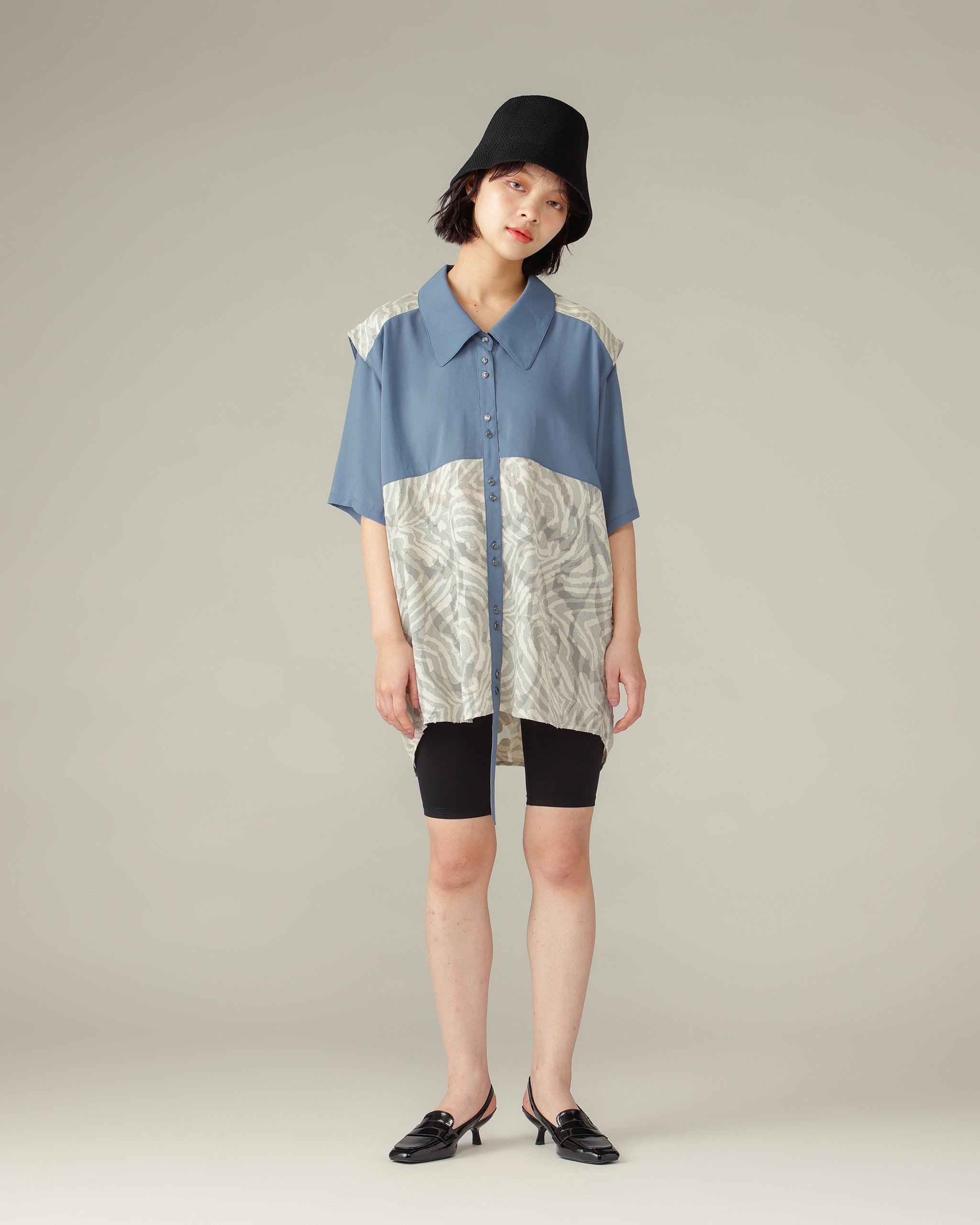 ベストを重ね着しているかのようなレイヤードライクシャツ。ソフトな風合いで程よい透け感があり、ゼブラ柄の部分はシフォンジョーゼットにジャガード織りが施され、立体感が特徴的。上品な色味と光沢が美しい貝調ボタンは、カジュアルすぎない綺麗めな印象に魅せてくれます。ドロップショルダーの落ち感が大人のこなれ感を演出し、ゆったり着れるユニセックスアイテムです。