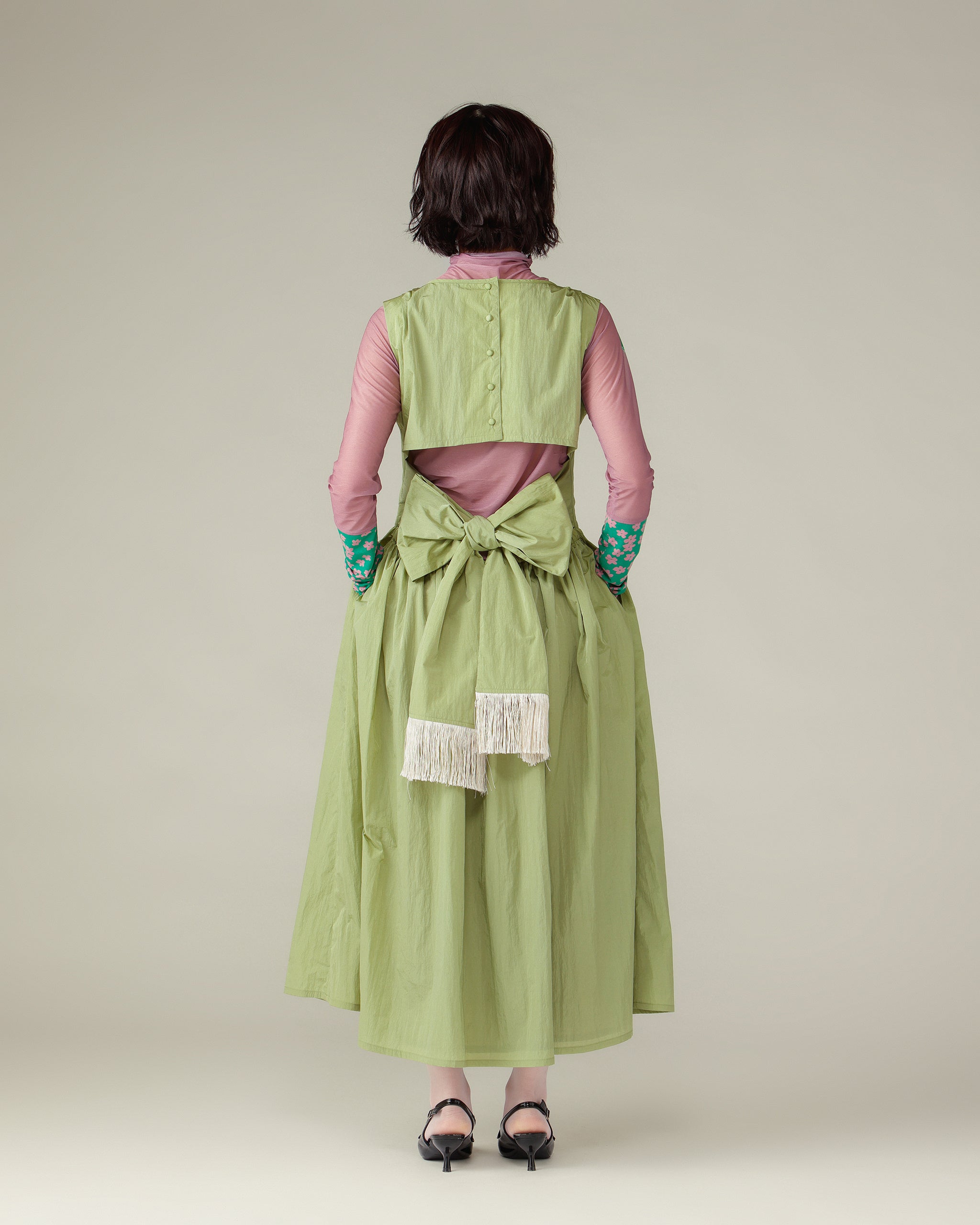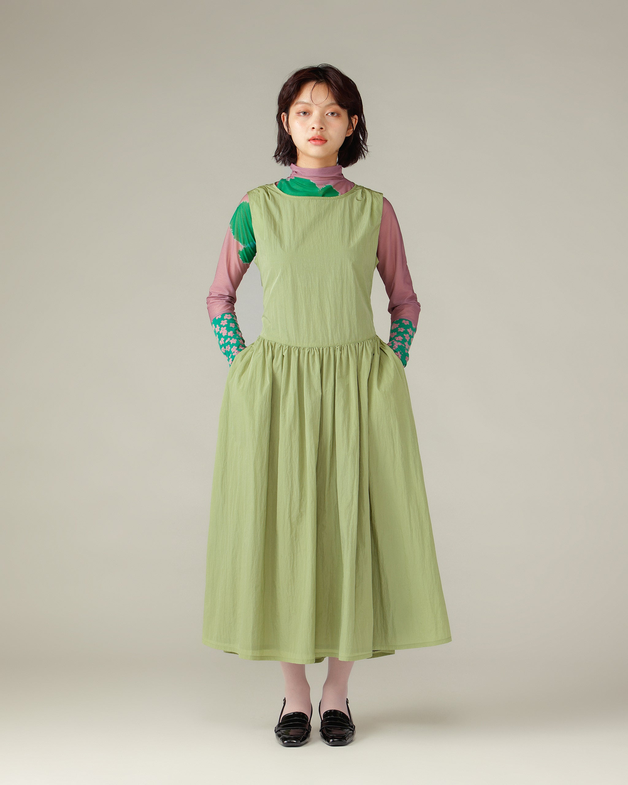 100%リサイクルナイロンを使用した、バックデザインが特徴的なワンピース。涼しげで軽やかさがあり、ヴィンテージワッシャー加工が施されているためシワにもなりにくい。ウエストリボンは前後で結べる2Wayタイプ。背中を見せたり、インナーを着たりといろんなスタイリングが楽しめる一着です。
