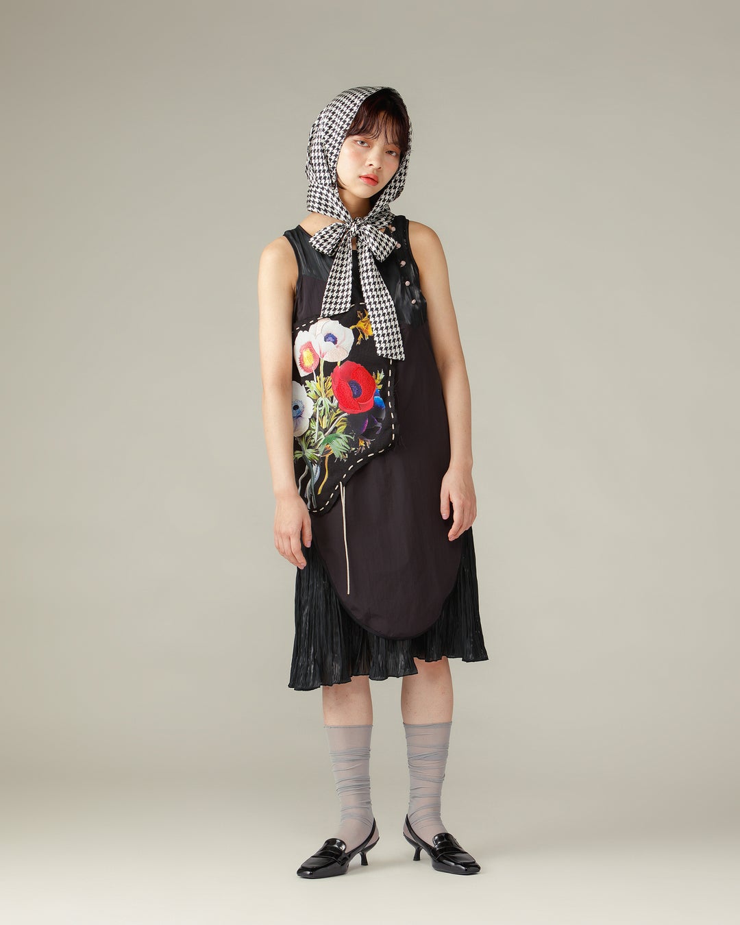 インパクトのある花モチーフが目を引くプリーツドレス。花には刺繍とスパンコールが施され、太めのハンドステッチが印象的。濡れたような艶が特徴なサテンとヴィンテージ感のある100%リサイクルナイロンを使用し、異なる風合いをミックスさせた一着。他人とは絶対に被らない、遊び心のあるスタイリングが楽しめます。