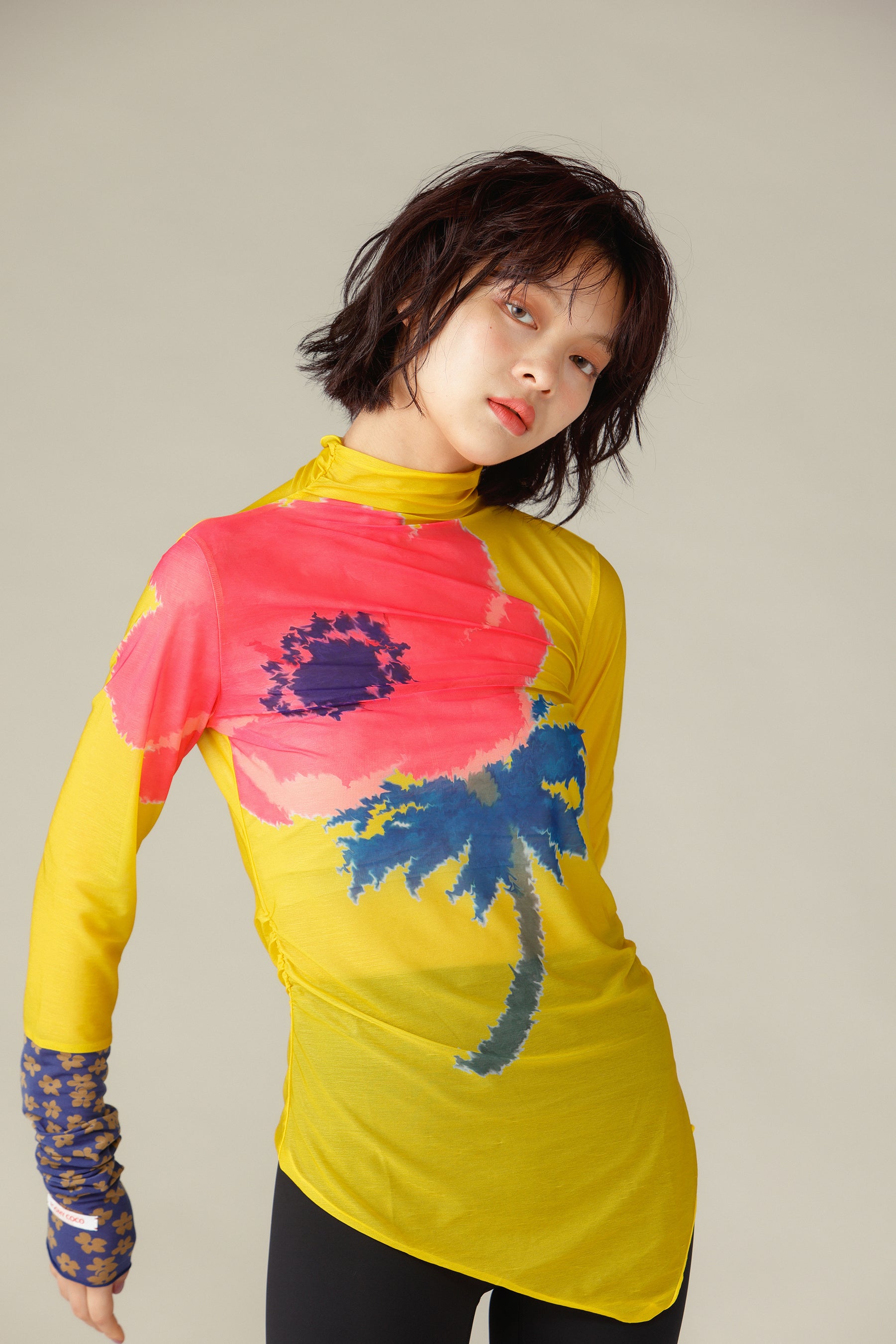 オリジナルの大花柄が印象的なシアートップス。柔らかくストレッチ性のある薄手天竺を使用し、着心地にもこだわった一着。一枚でもレイヤードのインナーとしても着用でき、様々なスタイリングが楽しめます。他で見ないスーパーロングの切り替え袖は、重ね着して見せても良し◎クシュっとさせても可愛い◎ウエストの両サイドにはギャザーを入れ、女性らしいディテールと細身えするのも嬉しいポイント。シーズン問わずお使いいただけるマストバイアイテムです。