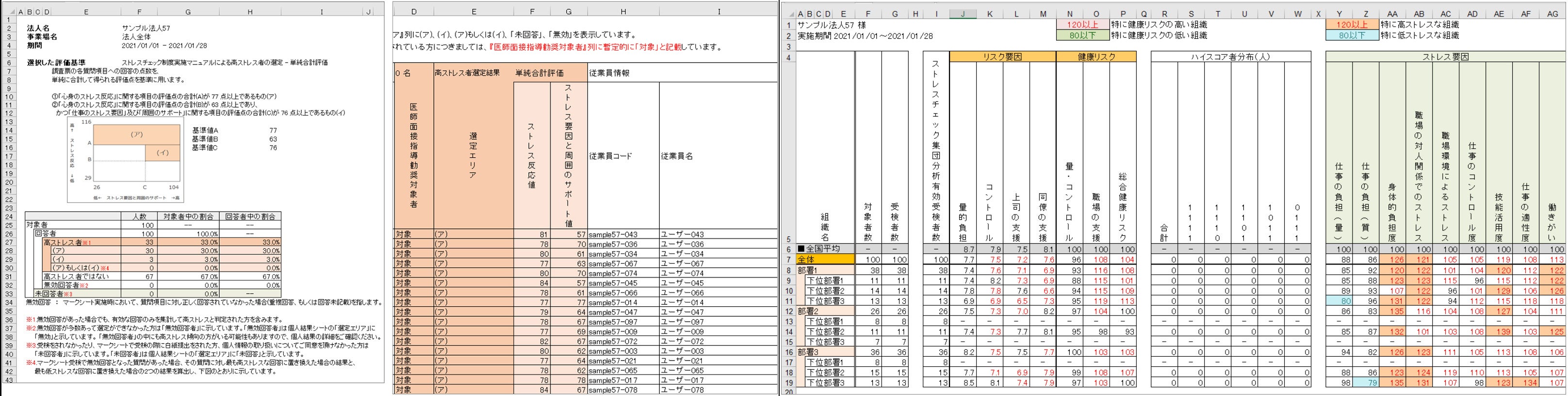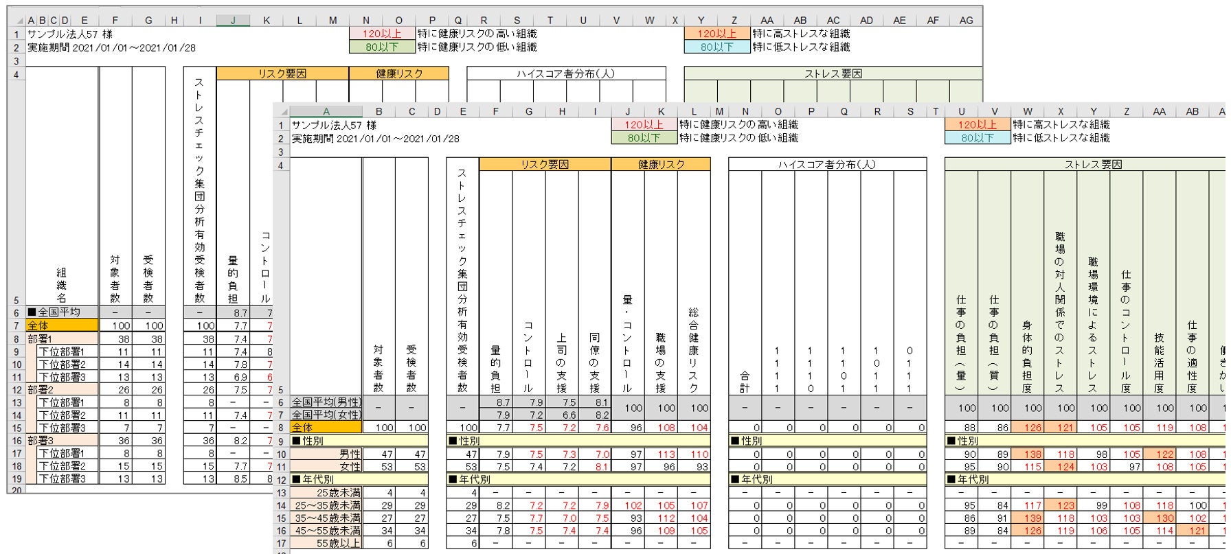 ▲ ストレスチェック分析データExcelファイルの例(法人全体レビュー・組織別分析詳細)