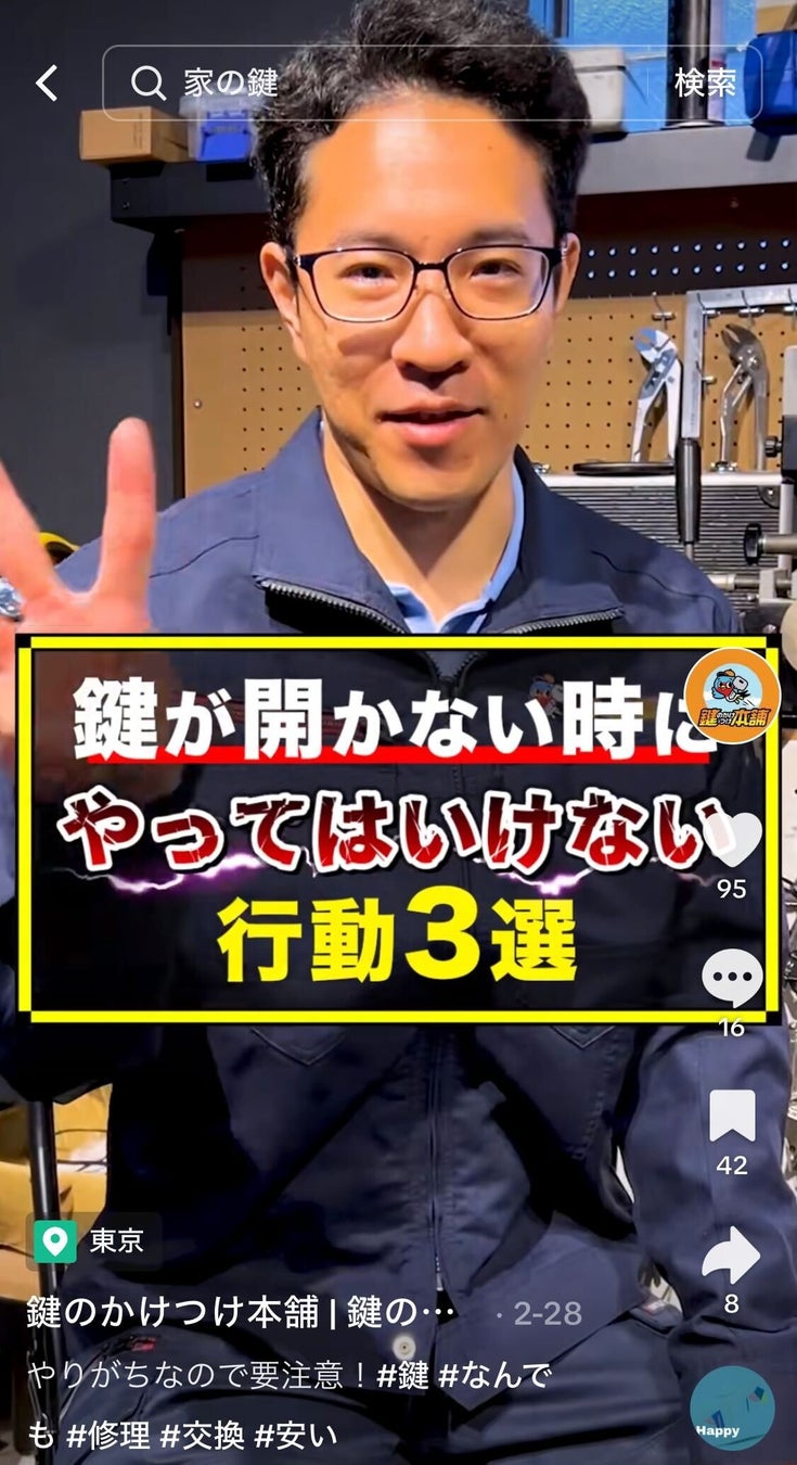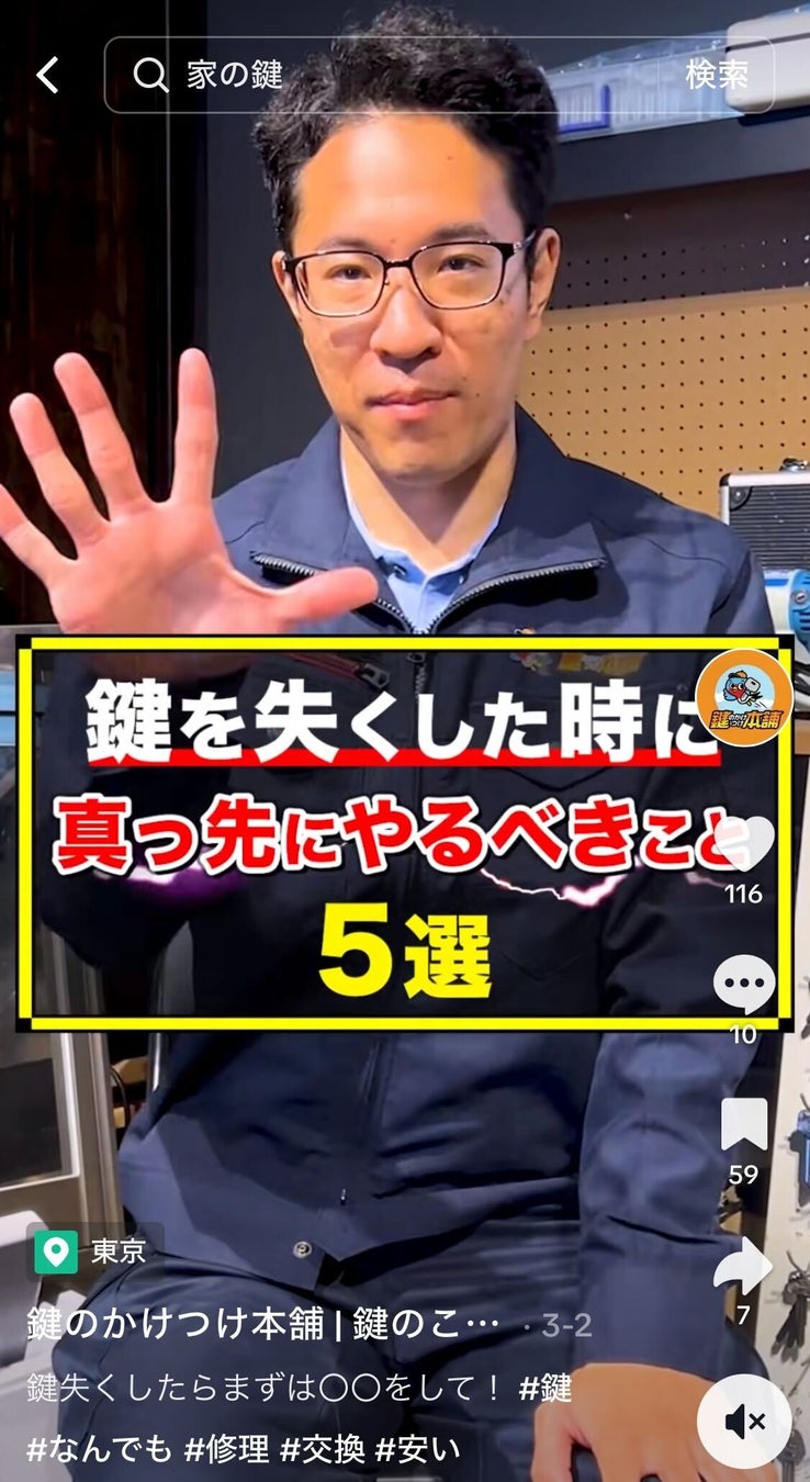鍵のかけつけ本舗は14都県に最短15分で到着し、安心の透明価格で鍵トラブルを解決してきました。現在、鍵のトラブルが起きると、不安や焦りからトラブルが更に深刻化してしまうケースが多発しています。(例:こじあけようとして、鍵穴が損壊する等)そこで、トラブルの深刻化を防止するべく、鍵トラブル解決のプロである鍵のかかりつけ本舗がTikTokアカウントを開設しました。