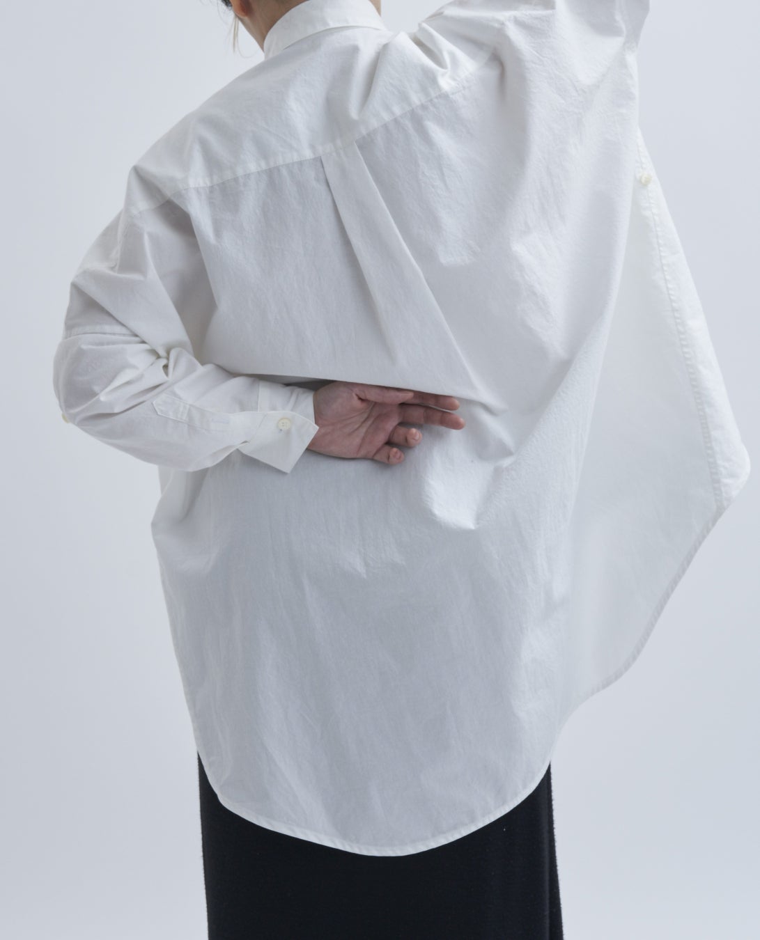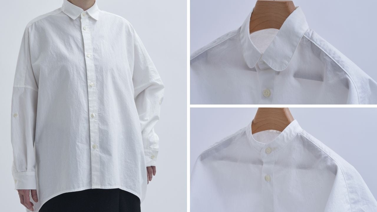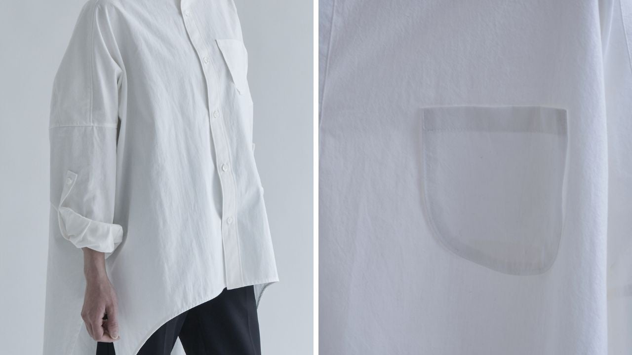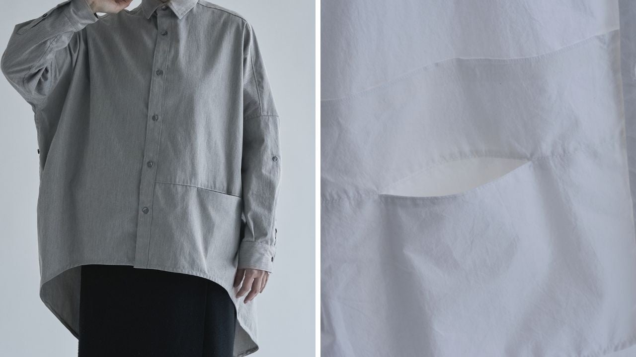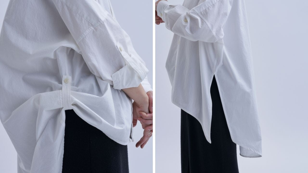 美容師の着衣は動作性、機能性、ファッション性に優れたものが求められます。デザインは全体の身ごろを大きめに取り、前身ごろ丈は短くすっきり見えるシルエットに。袖幅は細めにもたつかない動作性の工夫。機能性は腕にループを付けたくし上げの固定とシザーケースを取り付ける想定で脇もループ又はスリットのオプションを選択できる。ファッション性は店内を動き回る美容師の姿が美しく見えるシルエットを意識しました。また、セミオーダーは同じ生地の数量が限定されている残反生地、襟、ボタンを選択でき限りなくオリジナルに近いシャツとなります。