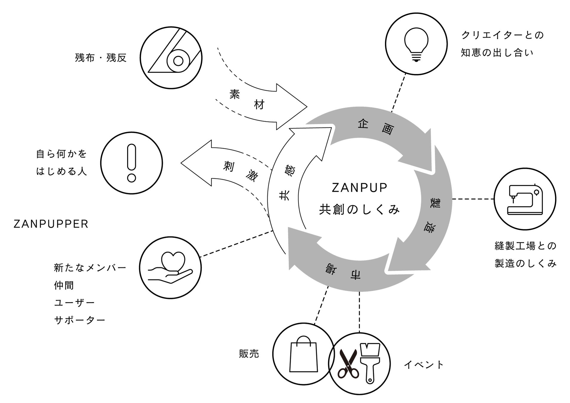 前述の通り、ZANPUPは廃棄される布を価値あるものに蘇らせるブランドです。廃棄される布を資産に変えていく取組を行っています。それには一緒になってご協力を頂ける企業や個人の方々とアイデアを出しながら取り組んでいくことで小さな活動が大きなウエーブを起こして廃棄される布が当たり前に使用される世の中になっていくことを目指していきます