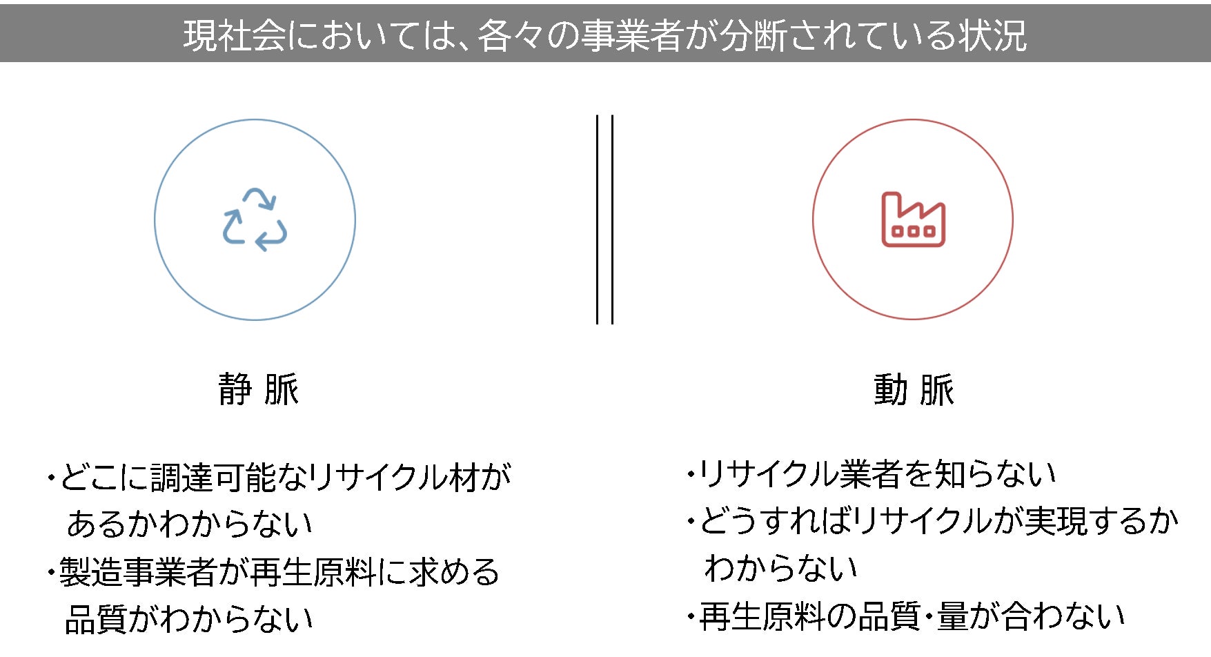 加えて、再生材の利用促進にあたり、動脈企業と静脈企業とが分断されており、情報連携・共有ができていないことも、リサイクル実現するための大きな課題となっています。
