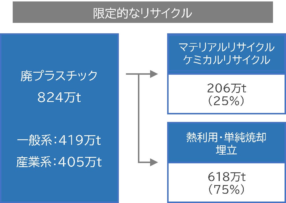 日本における廃プラスチックの循環利用の課題は、排出される廃プラスチックのうち、実に75%がサーマルリサイクル*、単純焼却、埋立処分となっていることです。