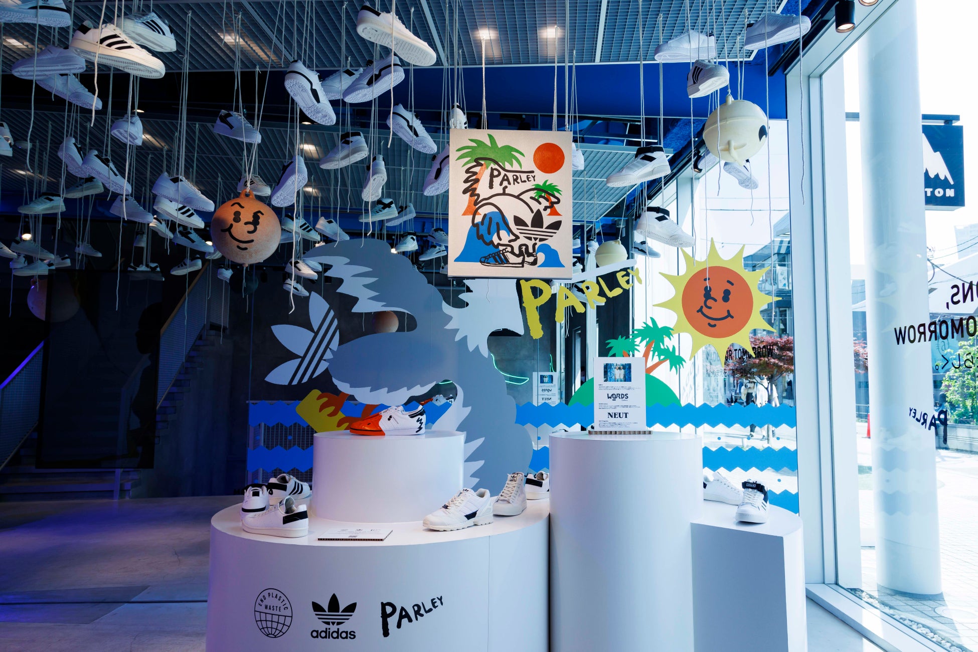 また、2022年4月には、adidas Originalsフラッグシップストア原宿のリニューアルにて、店舗1FのインスタレーションをWORDS Galleryにて監修・プロデュースをしました。このリニューアルオープンは、adidas Originalsが海洋ゴミをアップサイクルして生まれた素材を使用した「adidas Originals by Parley」の発売と合わせたものです。