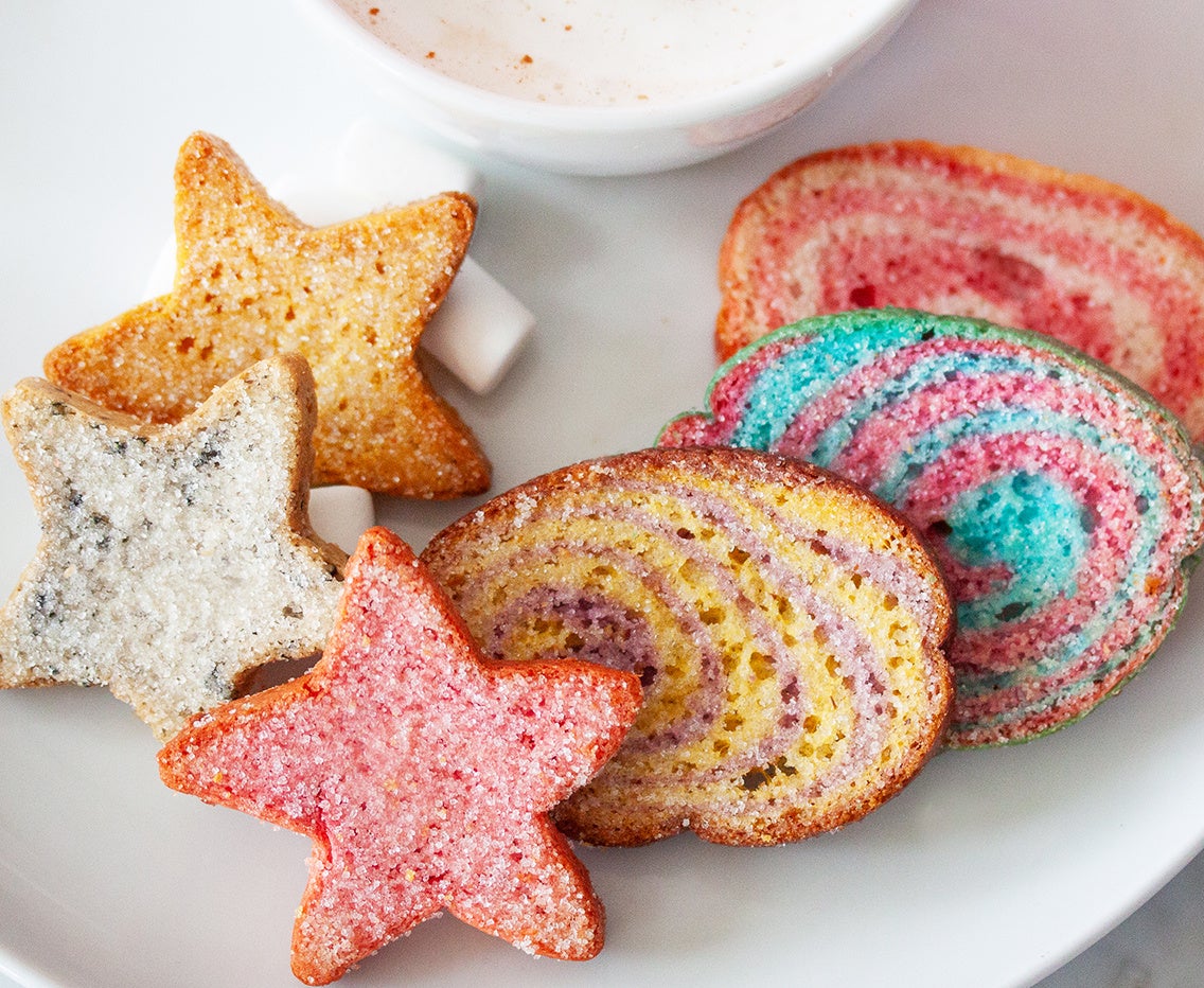 星や波のうずの形をモチーフに、湘南の恵みと優しさを込めて一枚一枚丁寧に焼き上げたラスクは常時15種類以上をご用意。スタンダードからフルーツ、抹茶まで様々な味わいをお楽しみください。ラスクは130円(税込)〜/枚にてばら売り販売も行っております。