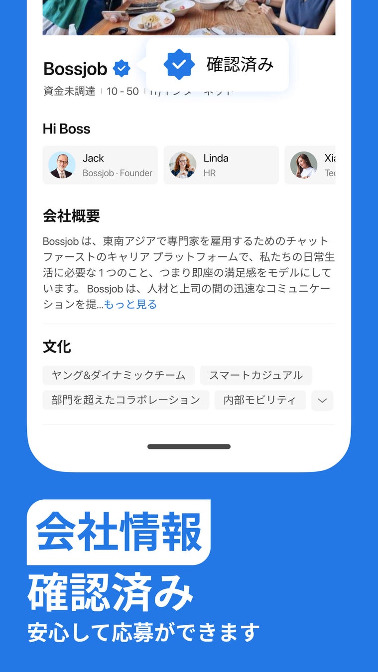「チャットテンプレートシステム」で300万人のグローバル人材に即時アプローチできるBossjobは、アジア各国をはじめ世界のトップ企業4万社で導入されています。簡単な情報を入力するだけで、AIが求職者の履歴書や企業の求人広告を自動生成する「AIキャリアアドバイザーシステム」を提供し、専属のコンサルタントのように求職者と採用担当者をサポートします。厳正な審査を受け承認された企業のみがBossjobに掲載され、ユーザーは安心して企業データベースを閲覧することができます。