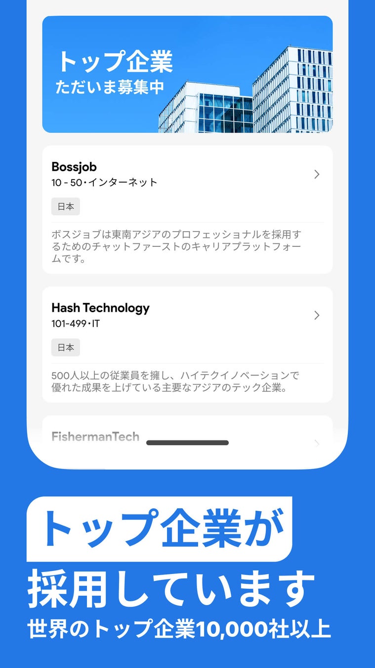 Bossjobは、2017年に世界初のAIをフィーチャーした人材プラットフォームとしてローンチし、シンガポールをはじめフィリピンやインドネシア、香港などアジア各国で展開してきました。初ローンチから約7年、Bossjobに登録した海外人材は累計300万人を突破し、Bossjobを導入した海外企業は4万社を超えました。AI採用アプリのパイオニアであるBossjobの日本市場へのローンチにより、海外企業で働きたい日本の求職者・外国人を採用したい日本企業のニーズにマッチした、グローバルな採用を叶えます。