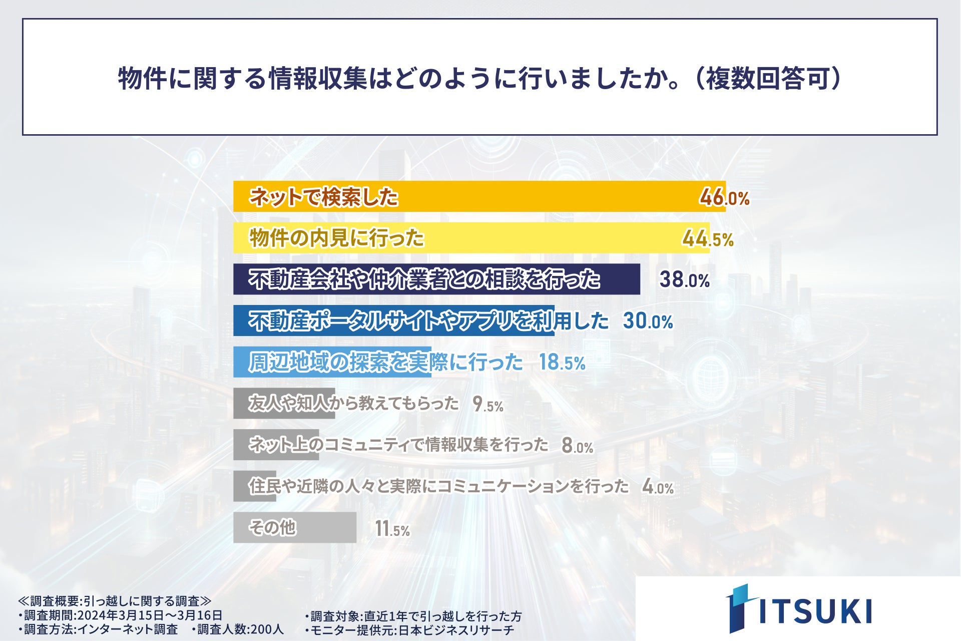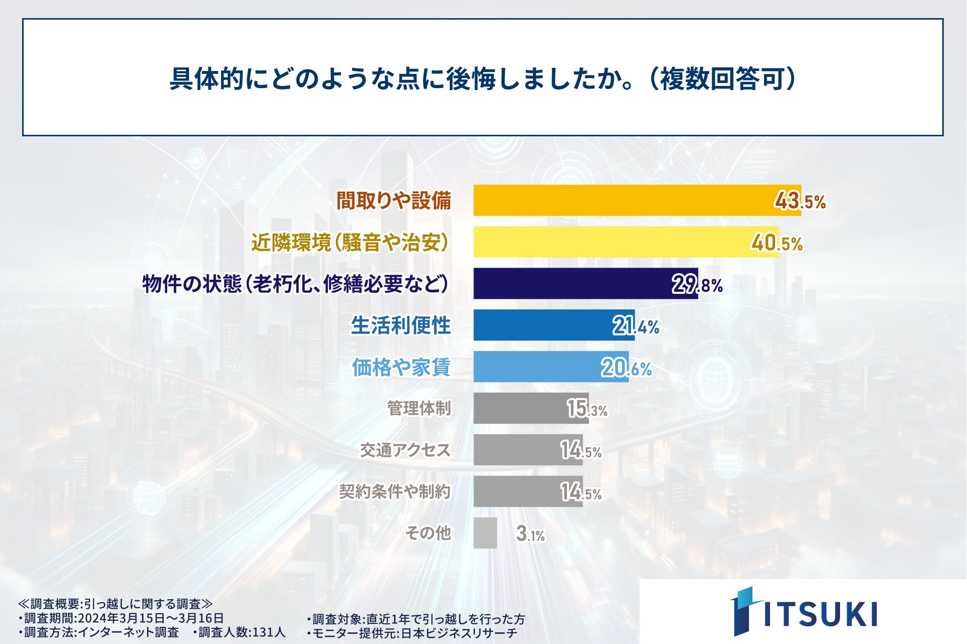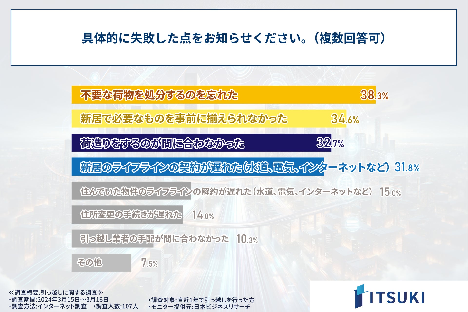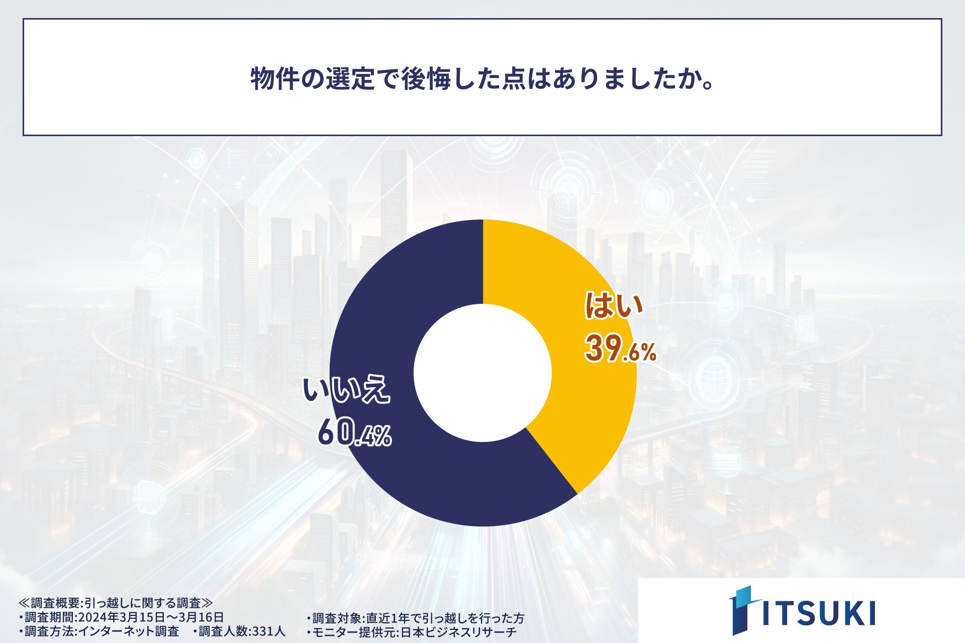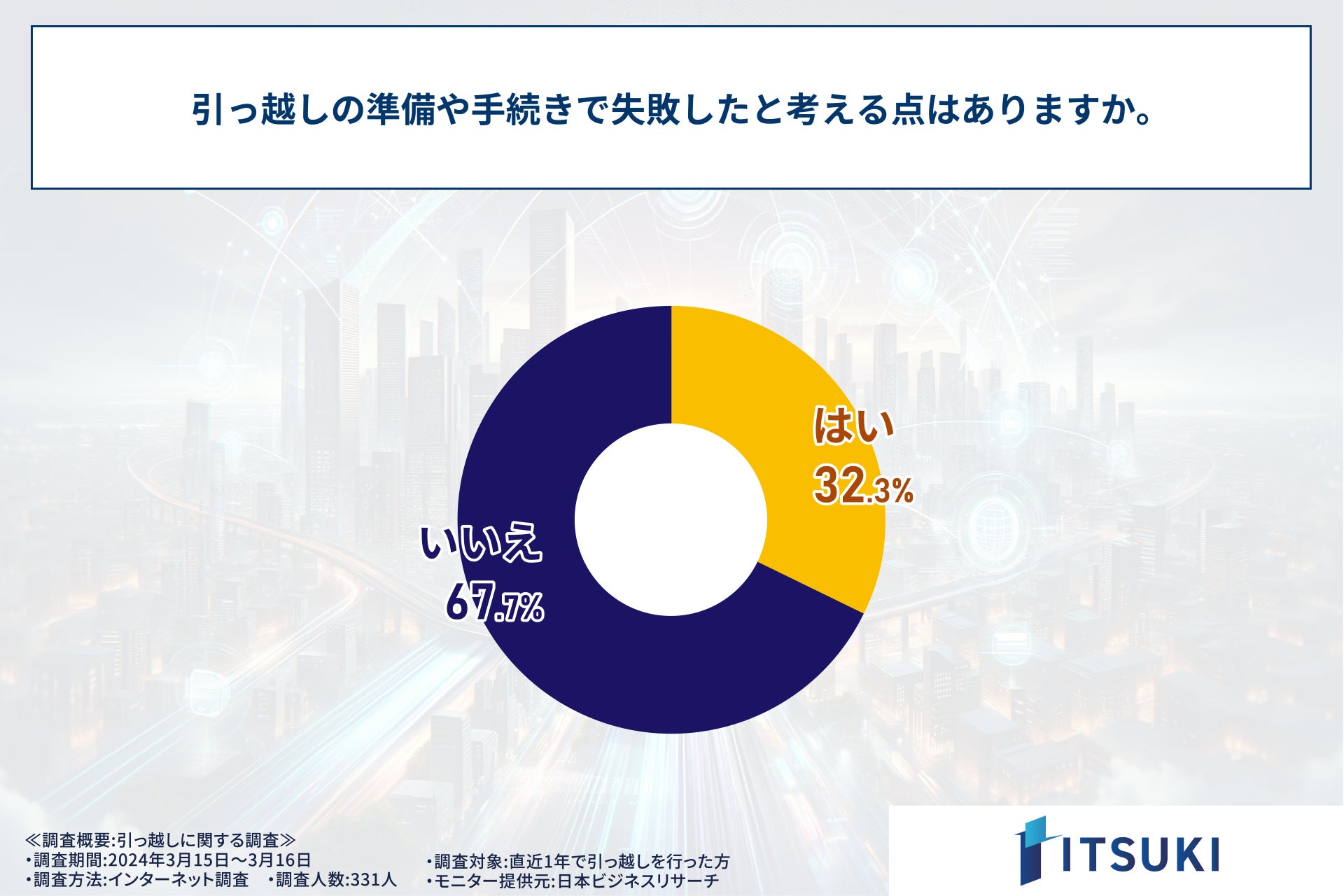 株式会社ITSUKI(本社:東京都北区、代表取締役:岩下 一樹)は、この度、直近1年で引っ越しを行った方331人を対象に調査を実施しましたので、お知らせいたします。