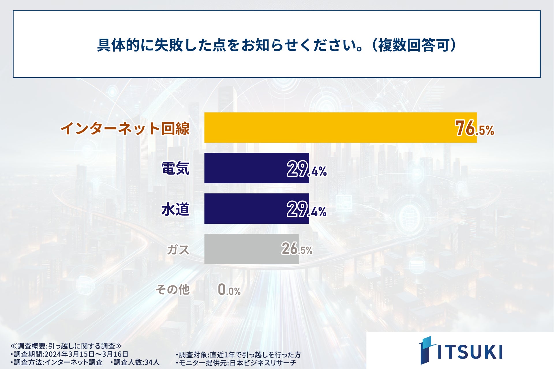 荷造りや荷ほどきに関する失敗が票を集める一方で、「新居のライフラインの契約が遅れた(水道、電気、インターネットなど)」が3割以上いる点にも注目です。ライフラインの契約が遅れた場合、生活に必須となる資源が使えなくなるので死活問題といえるでしょう。