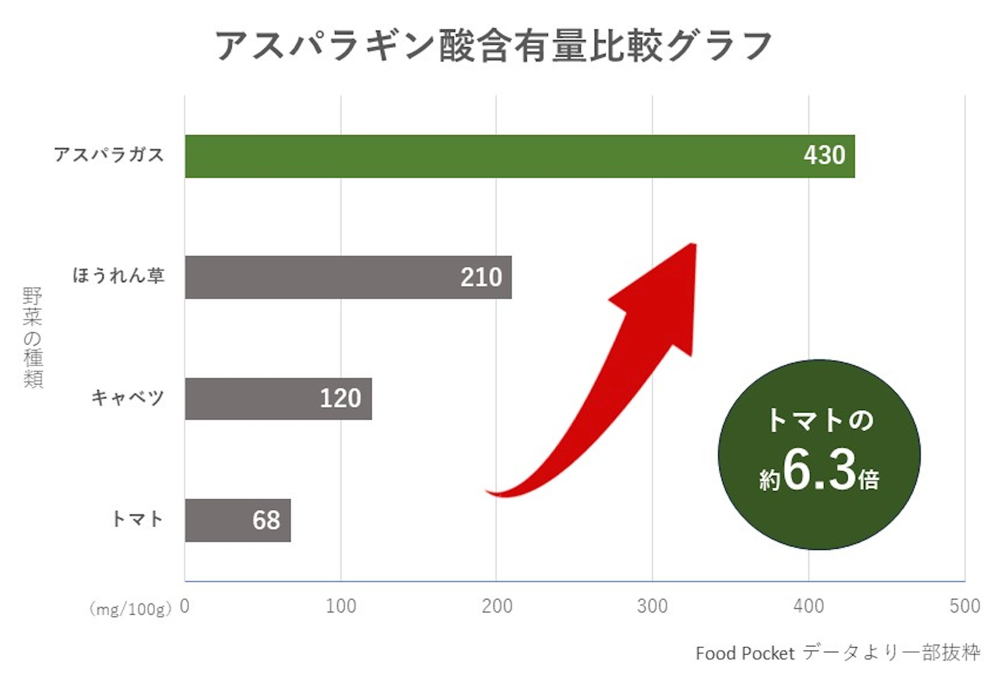 上伊那産アスパラガスは、中央アルプスと南アルプスに囲まれていることから、昼夜の寒暖差が大きいという厳しい環境下で育つため、アスパラギン酸を豊富に含み、トマトの6.3倍程度が含有されている。