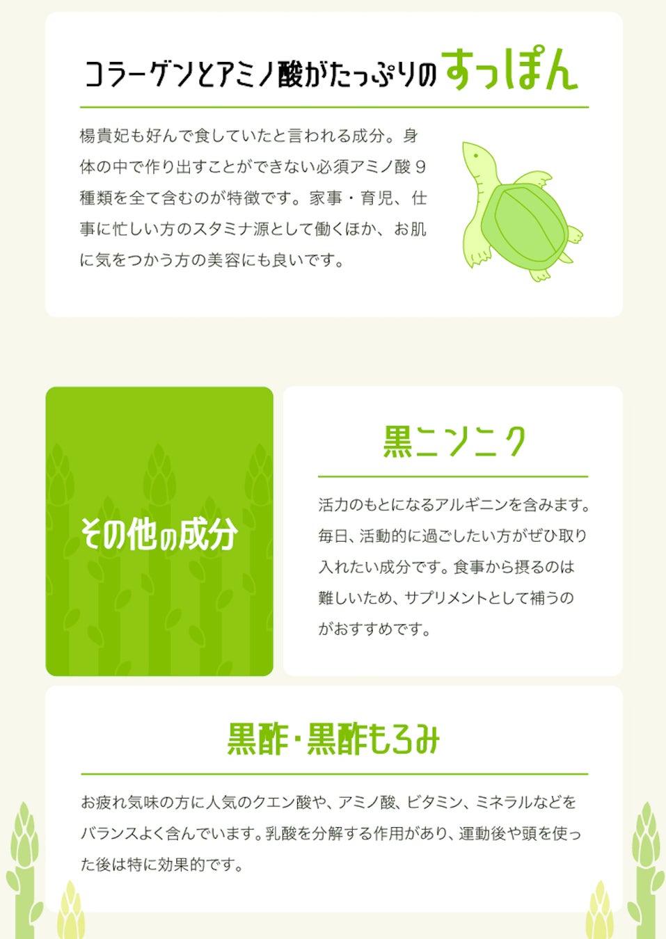 現代の働く女性の元気と綺麗のサポートを、アスパラと植物由来成分でサポートすることができれば、廃棄されているアスパラを有効活用できると考え、サプリメント事業者に開発を依頼しました。