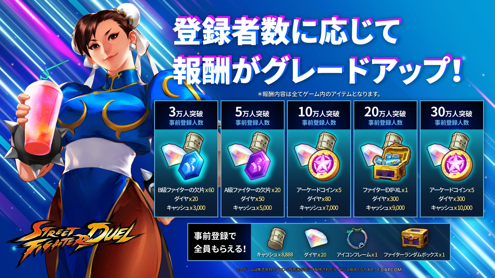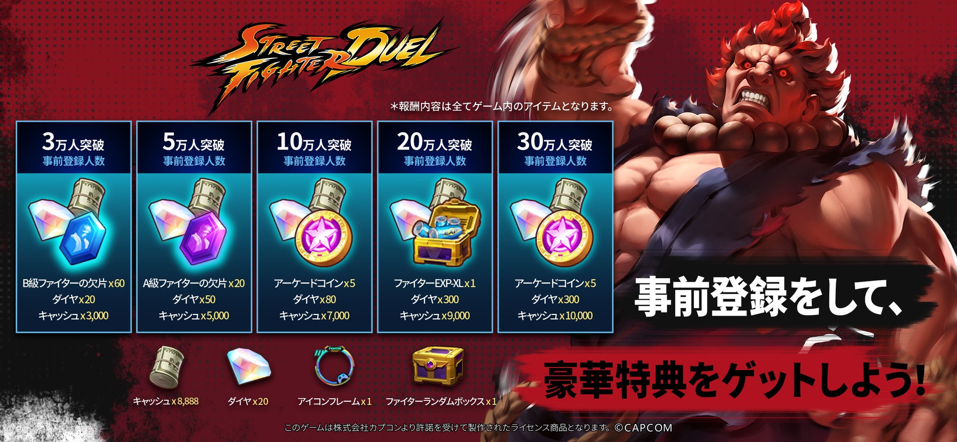 A PLUS JAPAN株式会社は、3月27日(水)配信予定のスマートフォン向けアプリ『ストリートファイター:デュエル』の事前登録を2024年2月20日(火)より開始いたしました。あわせて、事前登録者数に応じてプレゼントのアイテムが増量されるキャンペーン、Amazonギフトカードが抽選で当たるキャンペーンを開催中です。
