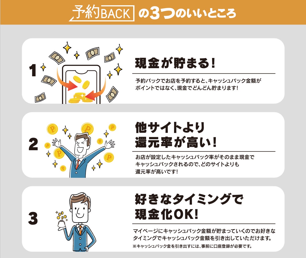 他サイトのネット予約では、ポイントでの還元となりますが『予約バック』では現金での還元となります。