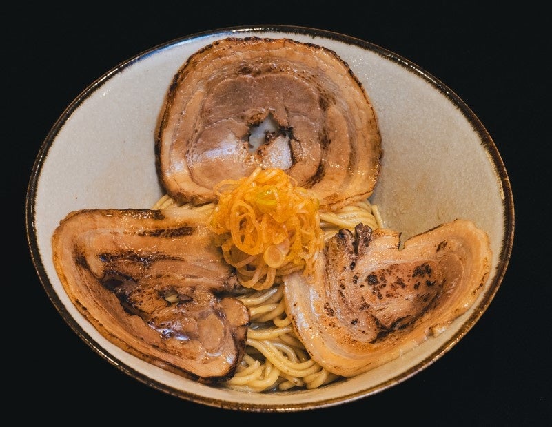 大判のジューシーな焼豚を直前に炎で炙った中毒性ある油そば。麺の上にジューシーな焼豚を3枚乗せたインパクトある仕上がりです。特製の醤油ダレ、隠し味に一味を加えた味付けの辛ネギ、炙り焼豚と、シンプルに美味しい一杯に仕上げました。