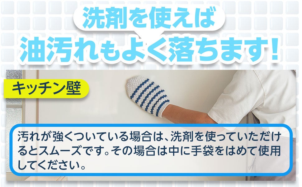 「水垢トレール」の内側にゴム手袋を装着していただければ、手を濡らさず掃除ができるほか、洗剤もお使いいただけます。特に油汚れがひどい箇所については、洗剤をつけてこするのが効果的です。