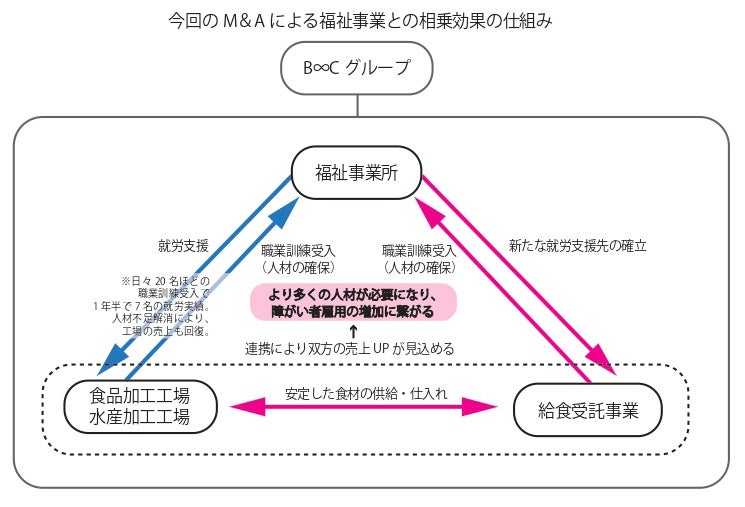 同社は、2020年には惣菜加工工場を、2021年には水産加工工場をM&Aし、就労支援という福祉との相乗効果によって人手不足を解決し業績を回復してきました。同事業も、過去の2工場と同じ人手不足や、素材の高騰等による仕入れ難という課題を持っていました。それらの課題に対し、実際に人手不足を解消してきた実績と、グループ内に食品加工工場があり安定した仕入れが見込めることを受け、M&A成立となりました。今回のM&Aを受け、同社内には新たな就労支援先が生まれ、今後さらに障がい者雇用の可能性が広がります。