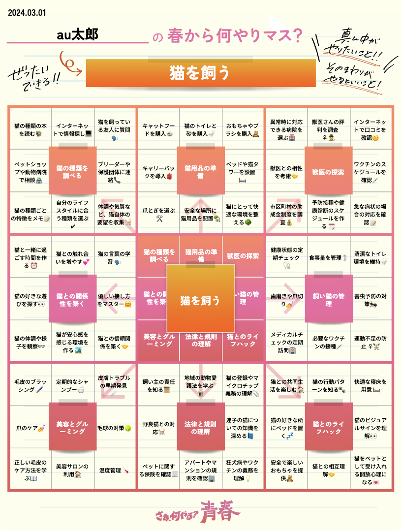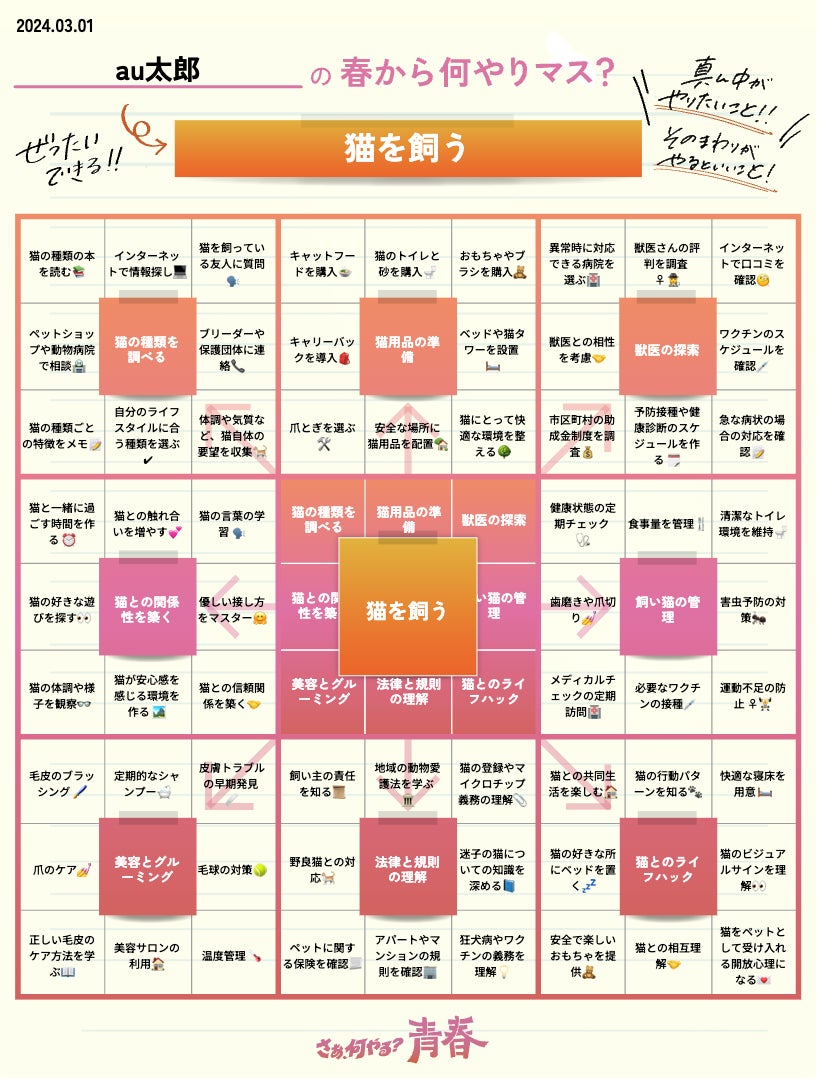 春に新しい一歩を踏み出す学生の方々の目標達成シートをAIが72項目にアクションを細かく分類した「#春から何やりマス?」企画を開始します。auは皆さんがこれからやりたいことや、チャレンジしたいことを応援します。