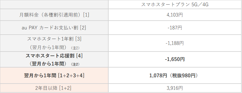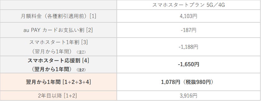 「スマホスタートプラン 5G/4G」加入申込の翌月から1年間1,650円/月割引