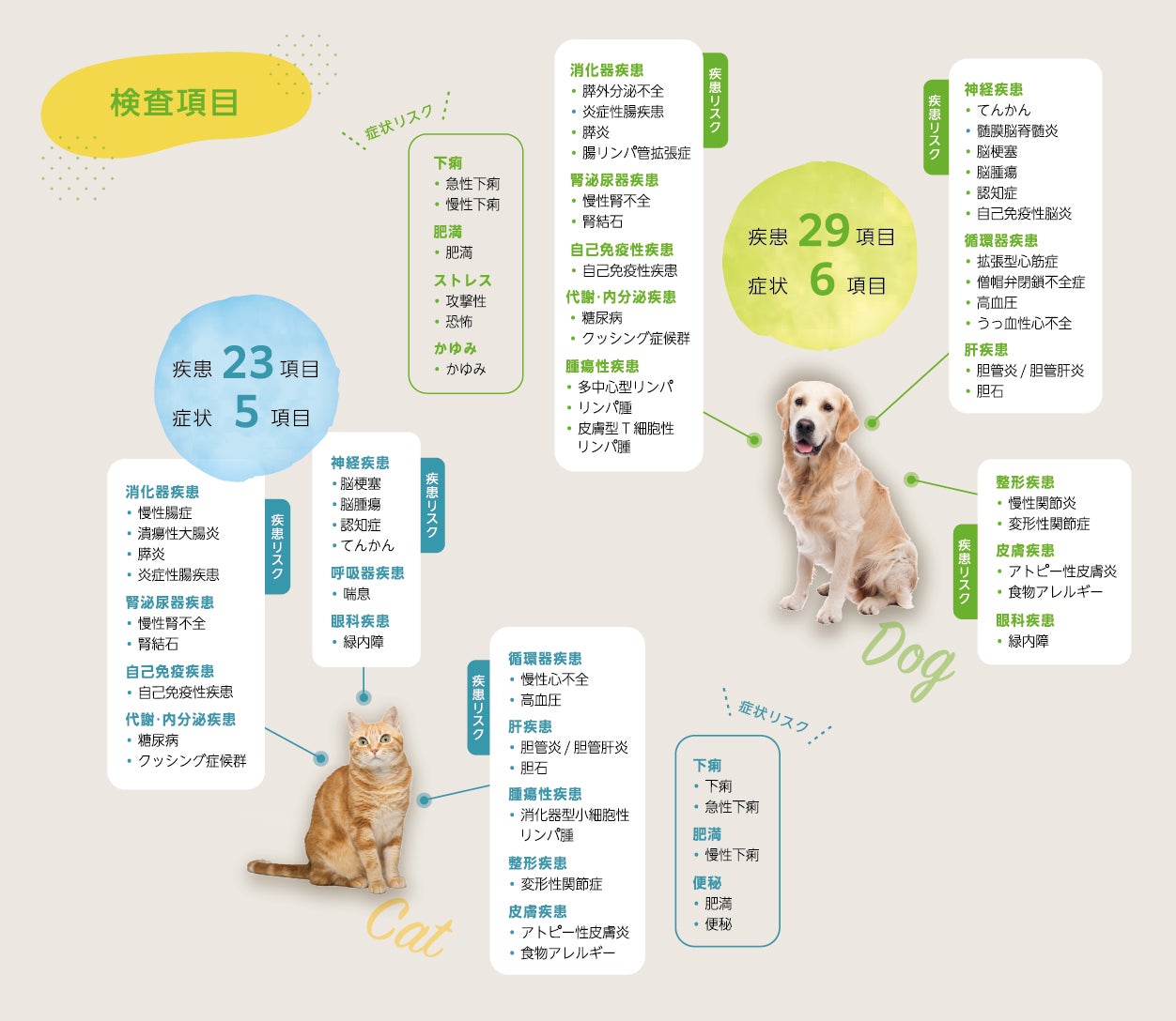 ペットの便から腸内フローラを解析し、日常的な症状から将来の病気のリスクまであらゆるリスクがわかります。