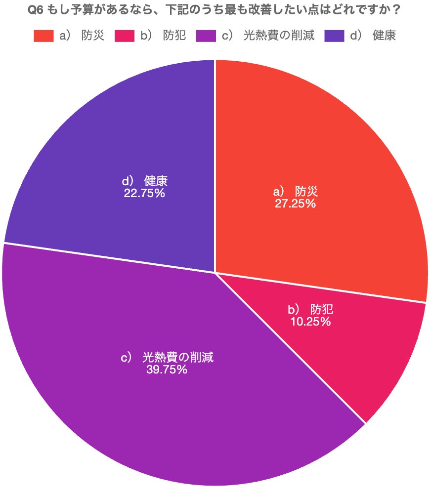 上記の通り、家庭内予算があれば防災27.25%、防犯10.25%、光熱費の削減39.75%、健康22.75%と改善ニーズの顕在化も見られる結果となった。