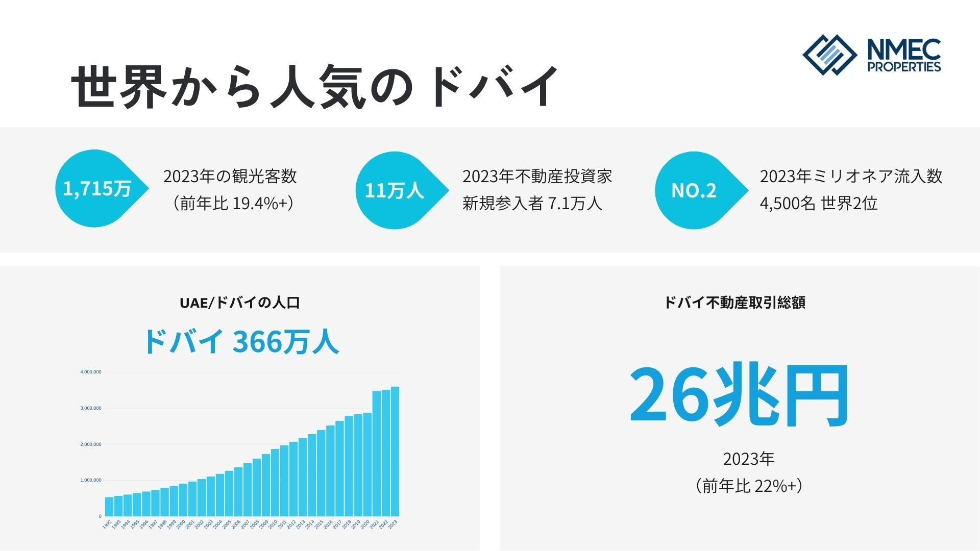 しかし、ドバイ不動産の正しい情報が日本市場に知られておらず、日本の投資家が投資機会を逃しています。 NMECプロパティーズは、正規ドバイ不動産仲介であり、ドバイ不動産の専門家として、正確な情報を日本の投資家に届けます。