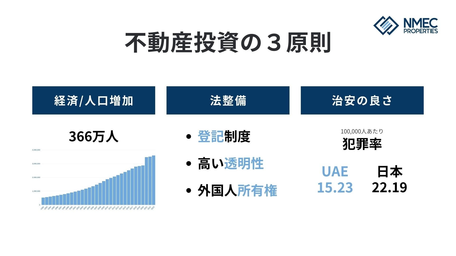 日本が直面している人口減少と超高齢社会という課題に対し、ドバイ不動産は一つの選択となります。ドバイは「不動産投資の3原則」という観点から見ても、世界でも珍しい最適な市場です。