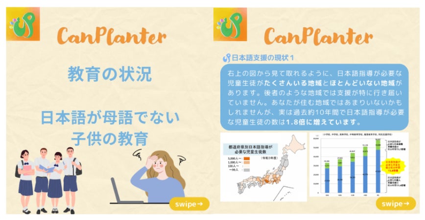 CanPlanterには、教育事業、環境事業、保護犬事業の三つの軸があります。私たちは、社会に対する小さな行動を通して、「自分もできる」という気持ちを育み、それが最終的に理想の社会の実現につながると考えています。だからこそ、日々の活動を通して、その小さな一歩を踏み出すお手伝いをしています。例えばインスタグラムでは、社会課題とそれに対して私たちが出来ることを発信しています。また、助けを必要とする人を紹介し、助ける側として行動してみてもらう活動をしています。今回の教育事業では、日本語を母語としない子どもに、「やさしい日本語」で授業をする先生として活動してもらうことがそれにあたります。