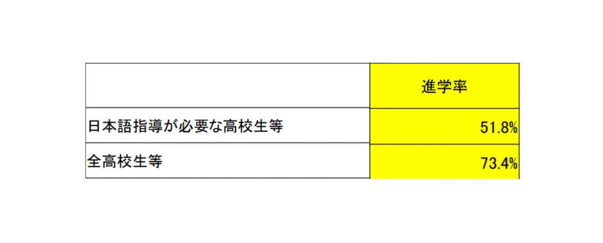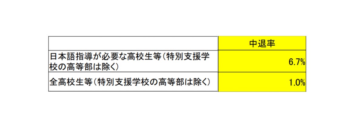 現在日本では、日本語を母語としない子どものほとんどが一般的な「日本語で授業を行う学校」に通っており、その数は増加傾向にあります(図1参照)。しかし、このような子どもたちは授業についていけず義務教育修了後、「高校受験」という壁を乗り越えられないのが現状です。また、高校受験を突破した比較的日本語が得意な学生でも、その後の進学を選択する割合は約半数(図2参照)、中退率も日本語が母語の学生に比べて5倍に上ります(図3参照)。このことから、日本語が母語でない子どもにとって進学が難しい現状がわかります。これは人生における選択肢が限られてしまっていることを意味します。