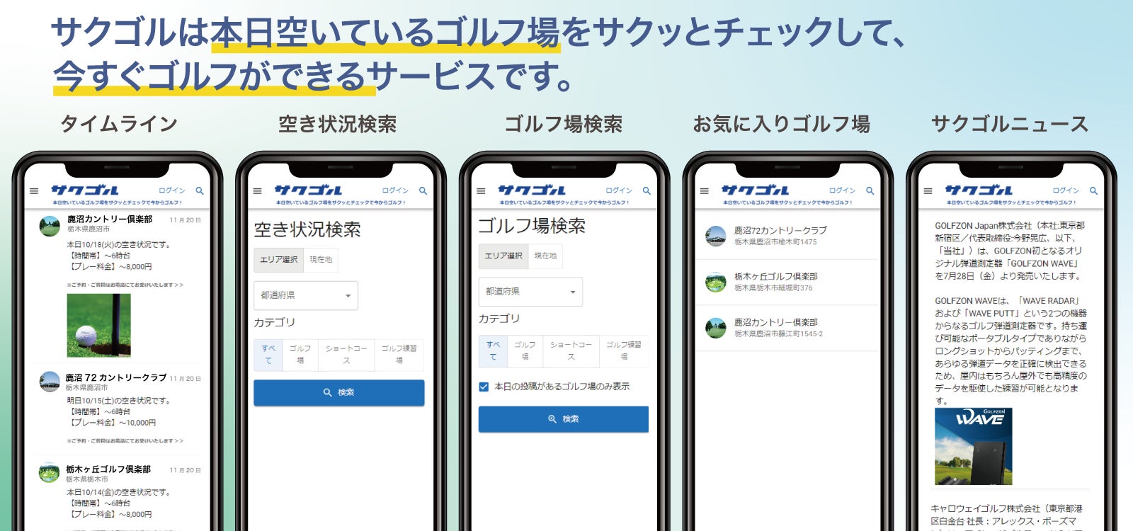 「サクゴル」は、リアルタイムでのゴルフ場の空き状況を配信することでゴルフ予約体験を進化させ、ゴルファーにとって新たな未来を提供します。ぜひ公式Webサイト「sakugol.jp」にご訪問いただき、我々のビジョンをご体験いただければ幸いです。我々はゴルフ業界の進化に貢献し続けます。