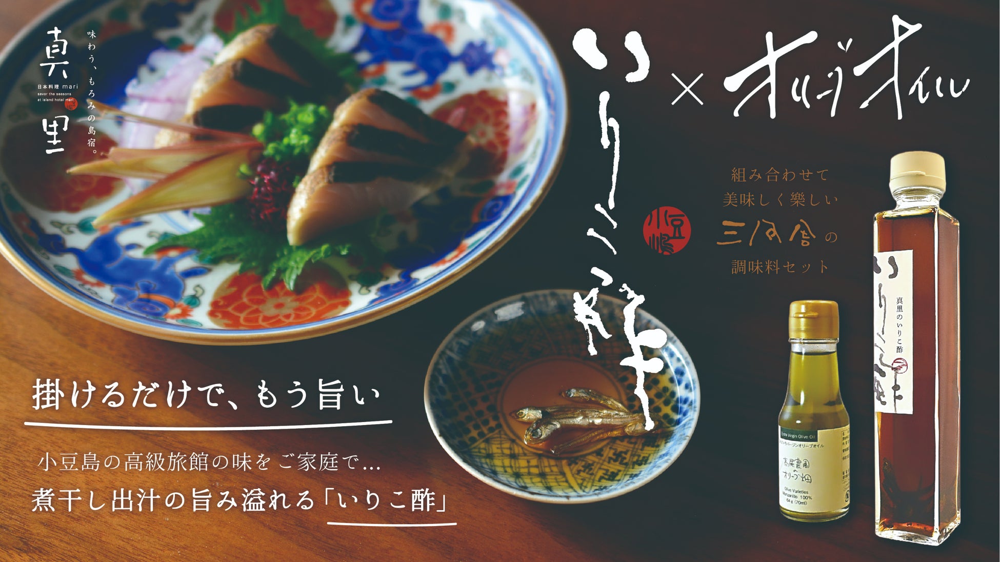 小豆島で創業20年以上を迎え、様々なメディアでも紹介される高級旅館の真里(有限会社真里|香川県小豆島|代表:眞渡康之)は、真里の料理の真髄である「和食×オリーブ」をご家庭でもお楽しみ頂ける、特別な「いりこ酢とオリーブオイル」のセットの先行予約販売をクラウドファンディングサイトMakuakeにて、7月23日より開始します。