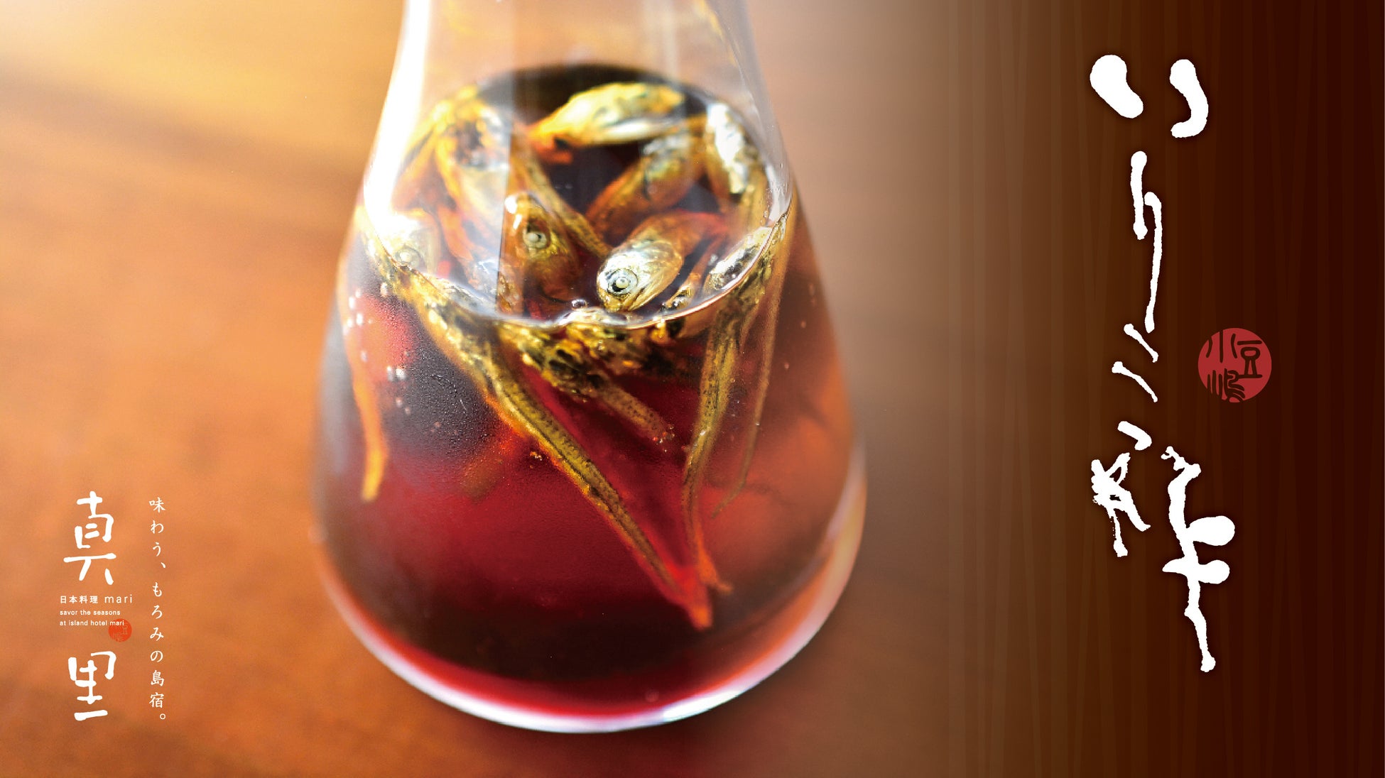 いわゆる「三杯酢」…日本料理では「土佐酢」とも呼ばれる、旨みと甘みを加えた「合わせ酢」があります。一般的には鰹節と昆布で旨みを取るところ、真里の『いりこ酢』は、瀬戸内らしく「いりこ」を使った新しい調味料です。