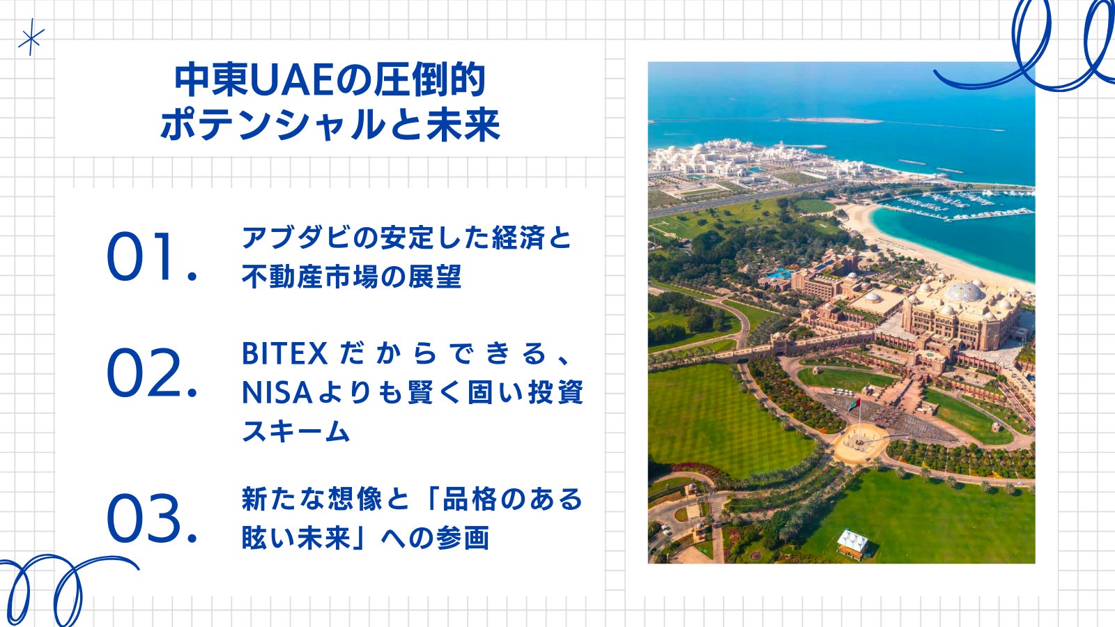 BITEXはアブダビ市場に大きな可能性を感じています。アブダビは、UAEの中心として語られるドバイと比較し、不動産市場の需給バランスが非常に良く、数%の低空室率と、利回りが高い健全な市場です。さらにアブダビは、UAE国土の86%以上を占め、GDPがドバイの2倍以上あります。2023年の超富裕層の移住先ランキングでは世界2位となり、財政、経済、治安ともに安定し年々成長しています。2024年以降もさらに市場が大きく伸びると予想されており、世界中から注目されています。