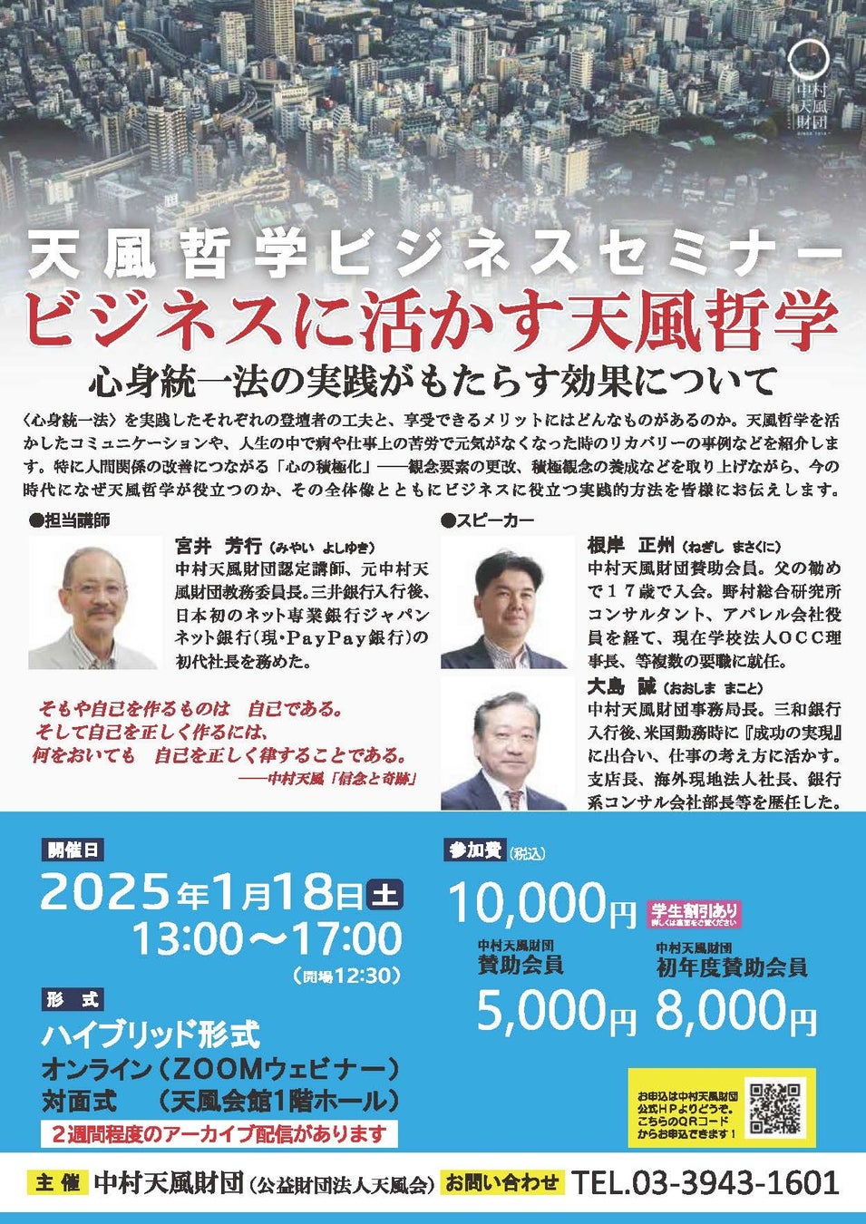 東京都文京区大塚にある公益財団法人天風会(通称名:中村天風財団 所在地:東京都文京区大塚5-40-8 理事長:山田真次)は、2025年1月18日ビジネスパーソンに向けたセミナーを開催いたします。職場での人間関係や、ストレスによる心身の不調等の悩みを「心の持ち方」を整えることで解決し、ビジネス成果を上げるためのプログラムです。