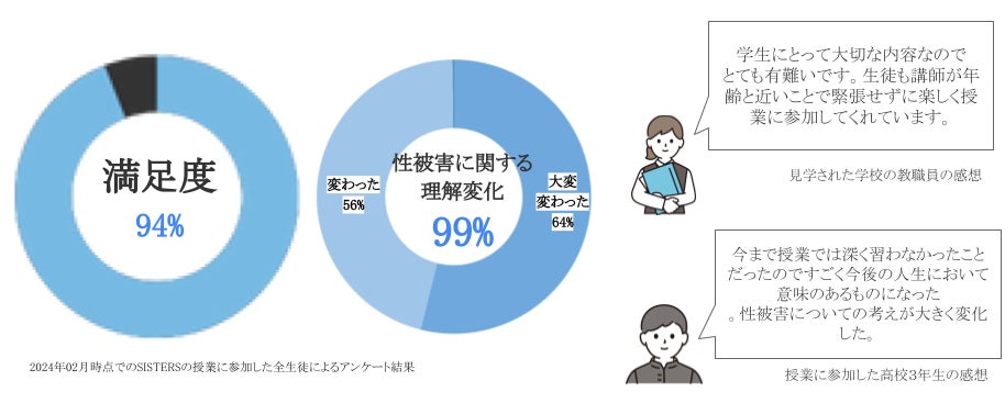 SISTERSの授業では、生徒さまや学校職員さまから満足度95%、理解変化度99%という高い評価をいただいております。