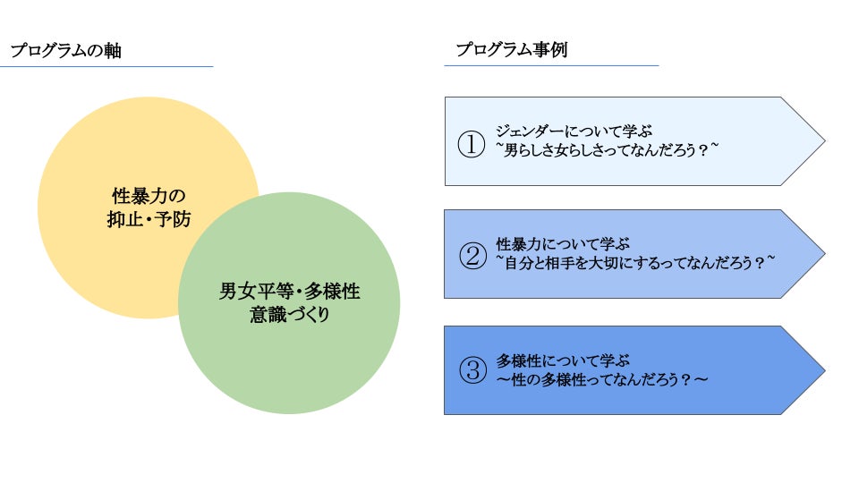 具体的には、⑴性暴力の抑止・予防教育、⑵男女平等・多様性意識づくりの2軸で授業内容を制作していきます。