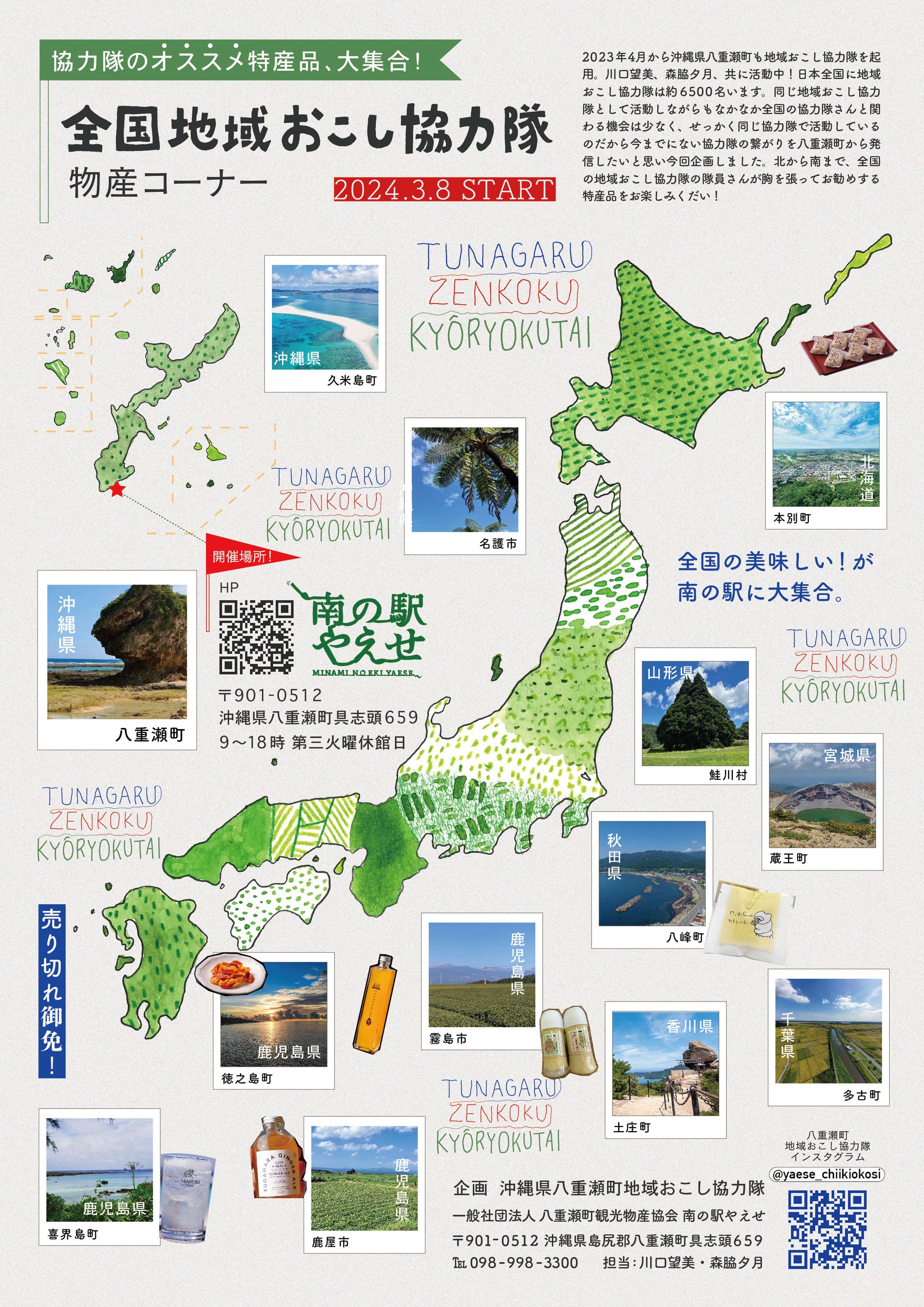 八重瀬町地域おこし協力隊が全国の協力隊に企画を呼びかけ、12地区の地域おこし協力隊が集結。それぞれの地域の特産物を集めて「全国地域おこし協力隊物産コーナー」を八重瀬町「南の駅 やえせ」に設置します!