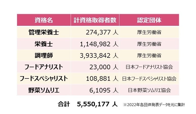 食関連の資格は、栄養士や調理士やフードスペシャリストなどの官民の大きな資格団体発表数のみを合計しても、国内に500万人を超えます。その資格の種類は多岐にわたり、栄養や野菜などの王道の専門分野から、発酵、薬膳、酒類などの資格もあります。
