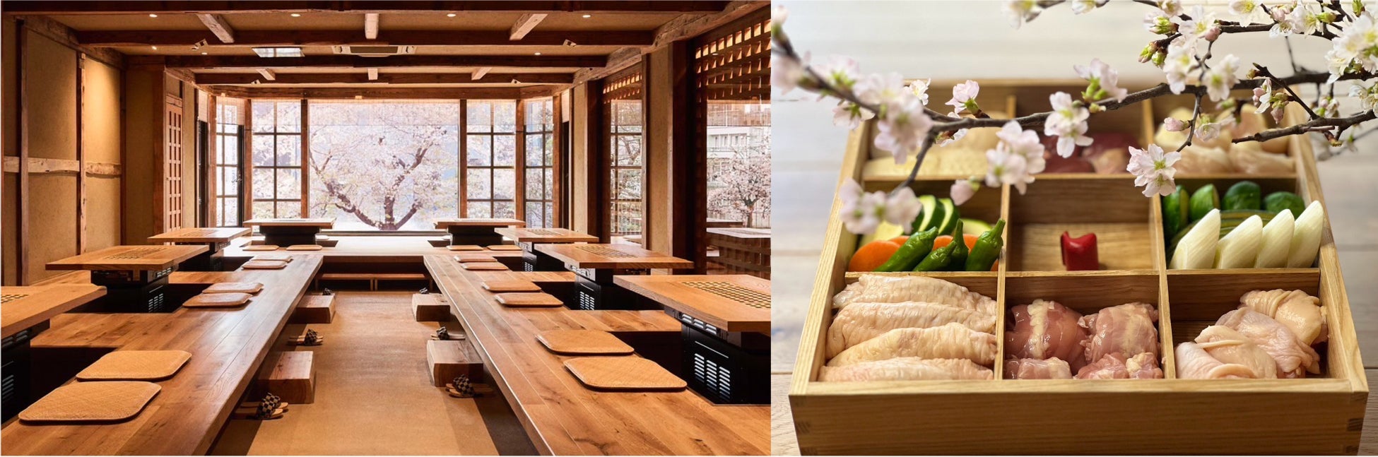 「鶏焼き肉 囲」のこだわりが詰まった「囲 花見特別コース」を、桜を独り占めできる店内で、これまでの焼肉とは一味違うスタイルでご堪能ください。