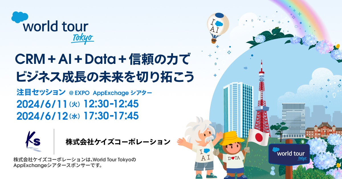 株式会社ケイズコーポレーションは、2024年6月11日(火)、6月12日(水) に「ザ・プリンスパークタワー東京」で開催される株式会社セールスフォース・ジャパン主催のイベント『Salesforce World Tour Tokyo 2024』にてセッション(セミナー)に登壇いたします。